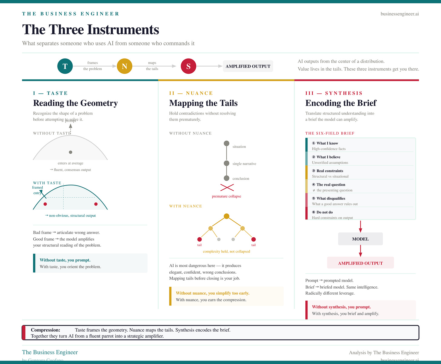Without taste, you feed the model a prompt. With taste, you feed it a properly oriented problem. The difference in output quality isn’t marginal — it’s architectural. The model amplifies whatever frame you give it. Give it a bad frame and you get a highly articulate wrong answer.