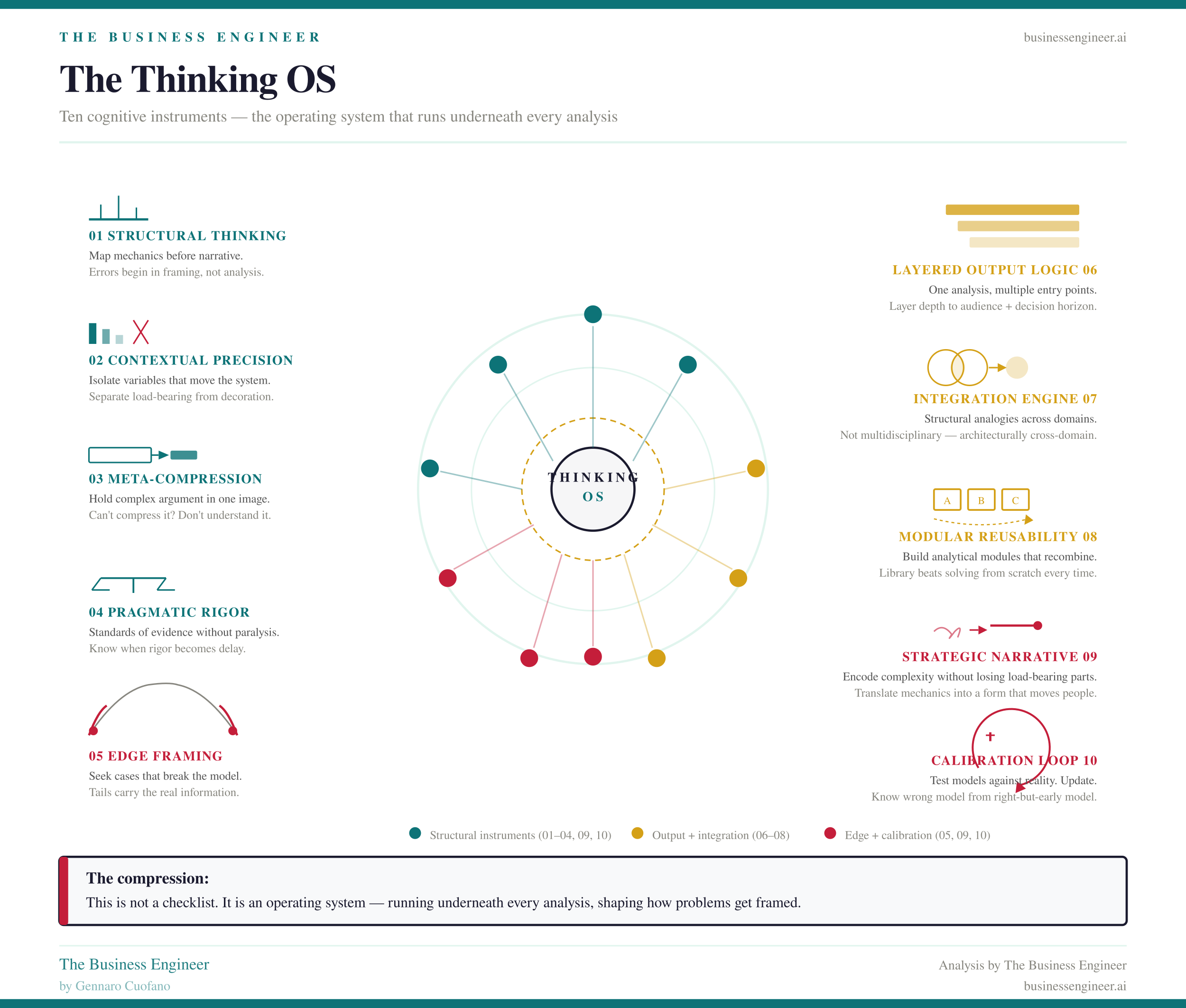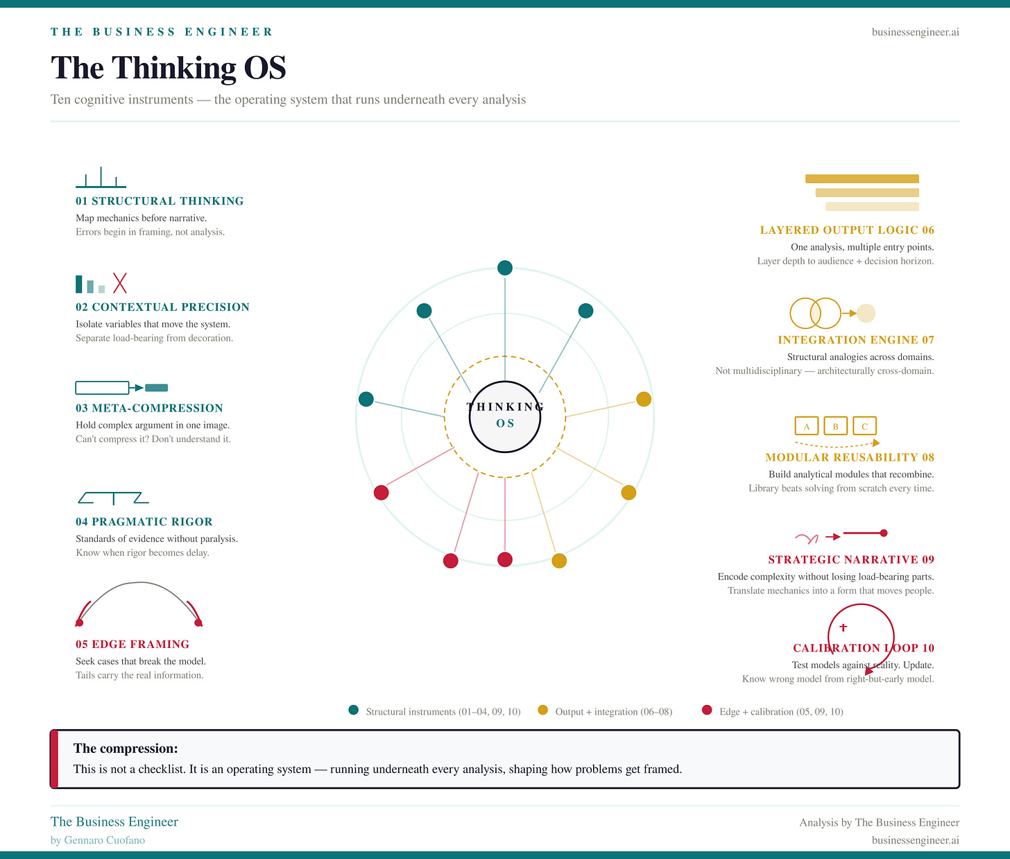The book’s intellectual core is a ten-instrument operating system for how a strategist processes reality. Not a framework in the consulting sense — a checklist to be applied and forgotten. An actual operating system: something that runs underneath everything else, shaping how problems get framed before any analysis begins.