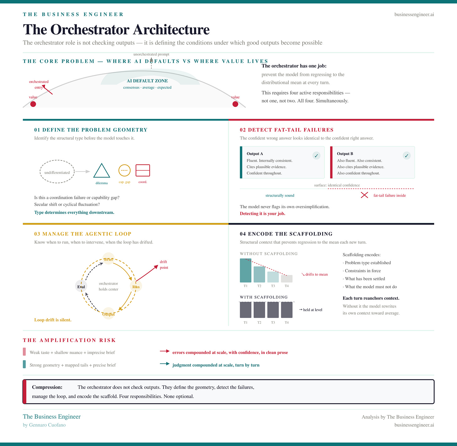 The Amplification Problem, addressed in Chapter 23, is the core risk: an orchestrator with weak taste, shallow nuance, and imprecise briefs doesn’t just fail to get value from AI — they actively compound their errors. The model takes whatever is imprecise in your thinking and returns it to you at scale, with confidence, in clean prose.