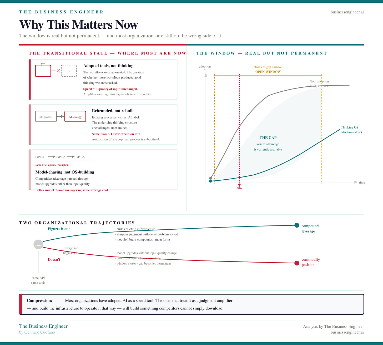 The window in which this distinction creates competitive advantage is real but not permanent. Most organizations are currently in a transitional state: they’ve adopted the tools but not the thinking. They’ve automated their workflows without examining whether those workflows were producing good thinking in the first place.