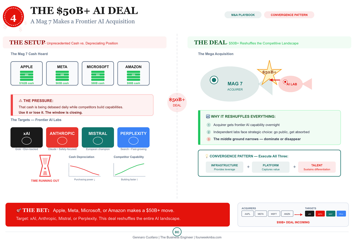 The Bet: A Mag 7 company (Apple, Meta, Microsoft, or Amazon) makes a $50B+ move on a frontier AI company (xAI, Anthropic, Mistral, or Perplexity).