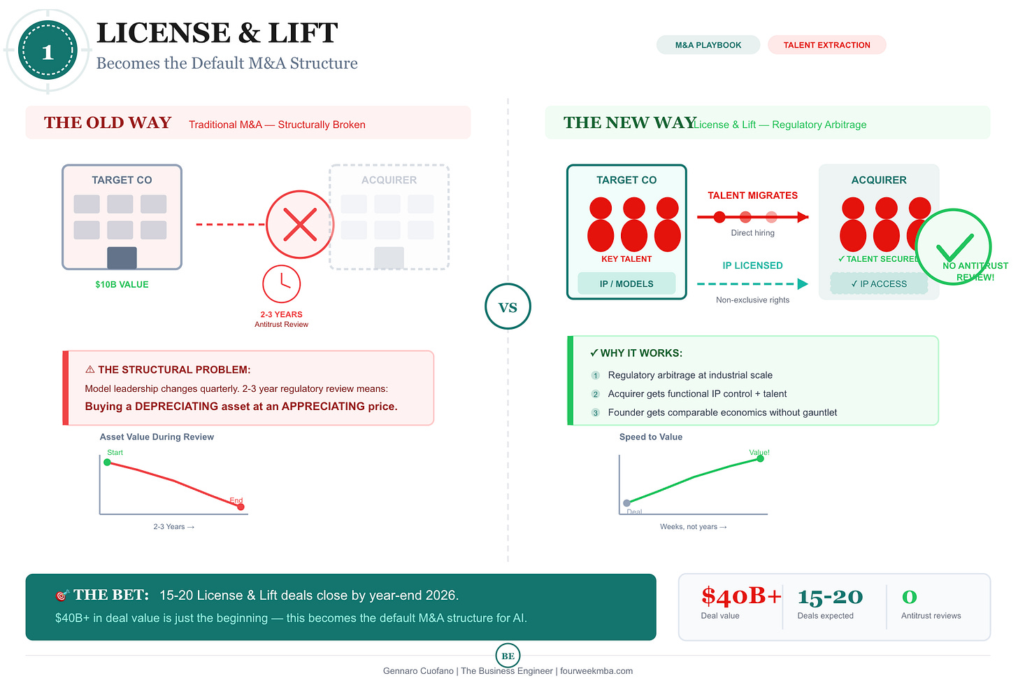 The Bet: “License & Lift” deals—IP licensing plus talent migration—become the dominant deal structure for AI capability acquisition. By year-end, expect 15-20 of these deals with increasingly sophisticated structures.
