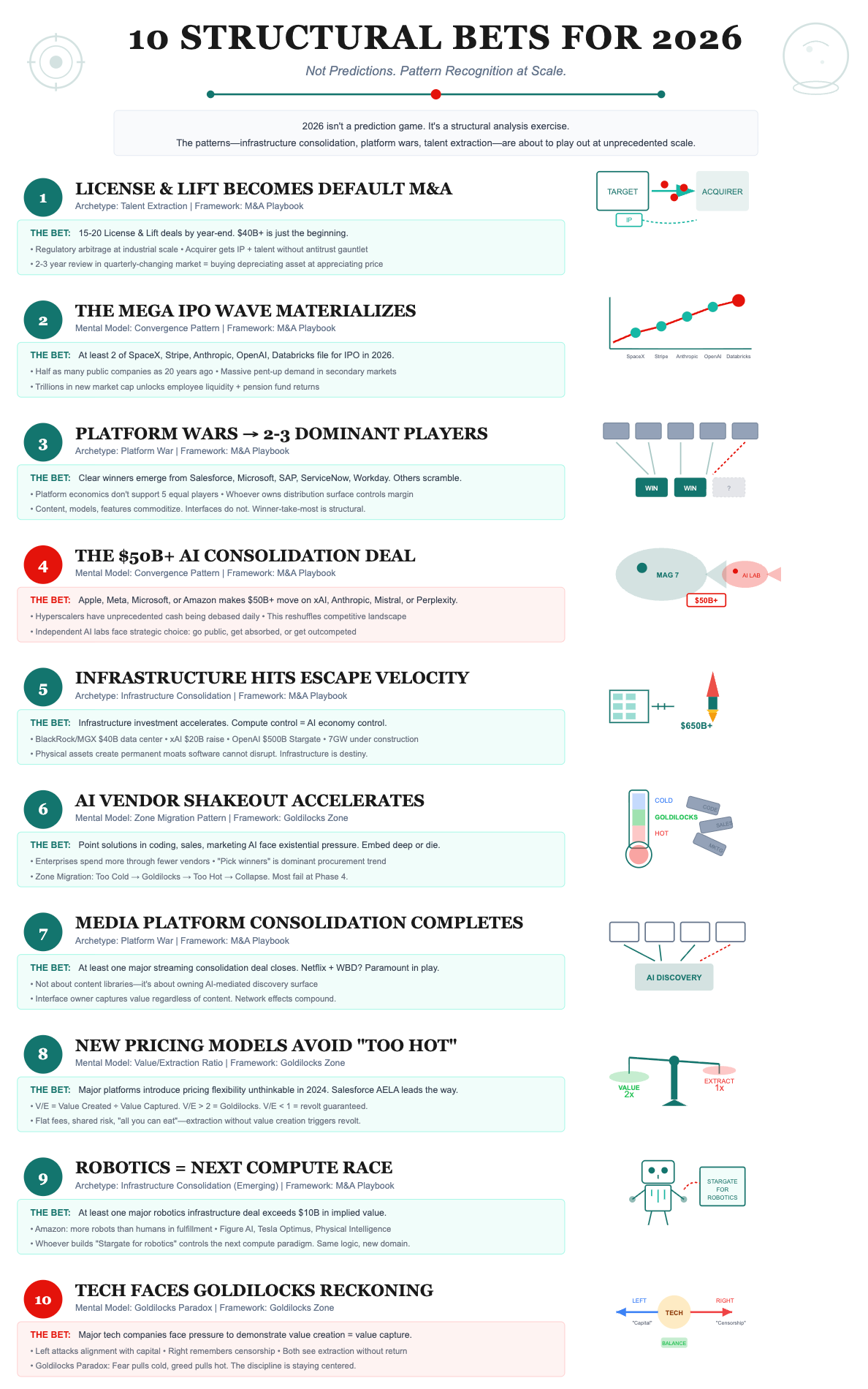 The patterns we’ve been tracking, infrastructure consolidation, platform wars, talent extraction, and embedding dynamics, are about to play out at unprecedented scale.
