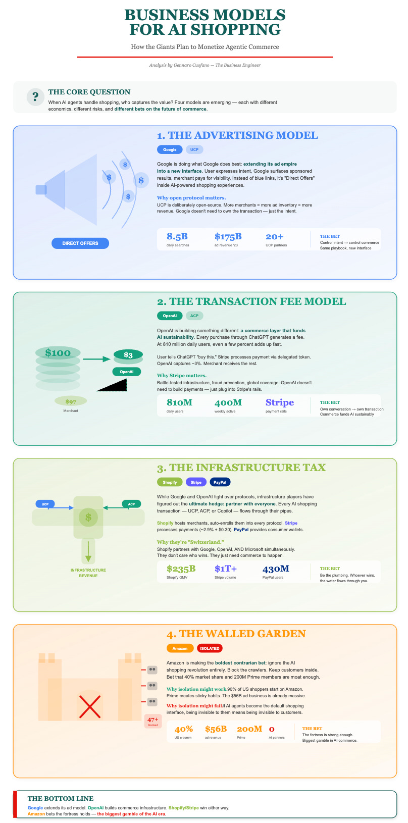 When AI agents handle shopping, who captures the value? The answer depends on where you sit on the journey and what you control. Four distinct models are emerging — each with different economics, different risks, and different bets on the future.