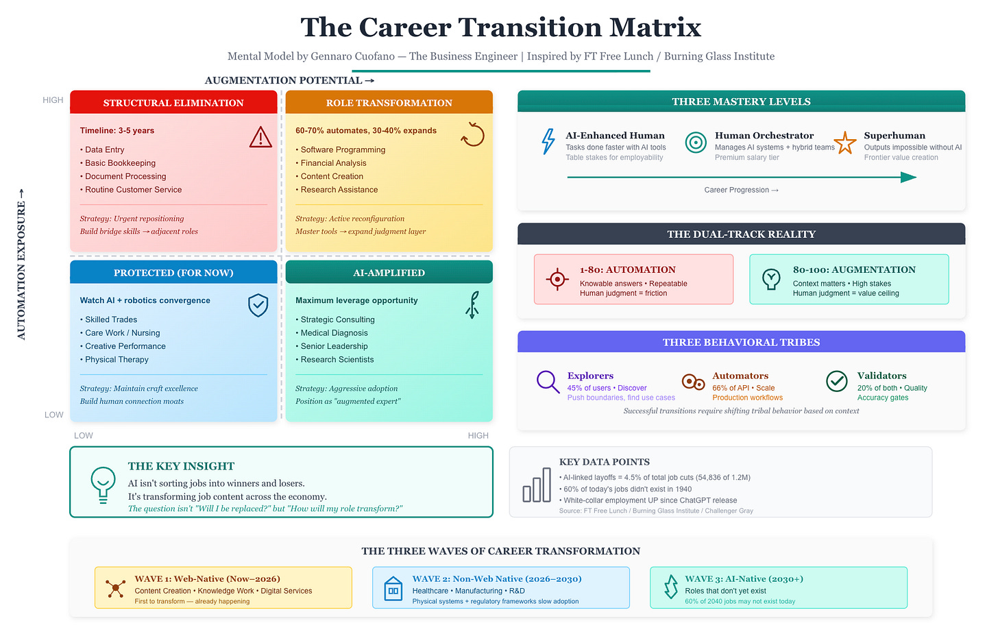 But here’s what the article reveals that matters more for strategic career positioning: AI isn’t sorting the labor market into winners and losers—it’s transforming job content across a broad swath of the economy. In there, the Burning Glass Institute’s analysis of millions of job postings shows that even as AI automates certain skills, it simultaneously elevates demand for others—often within the same roles.