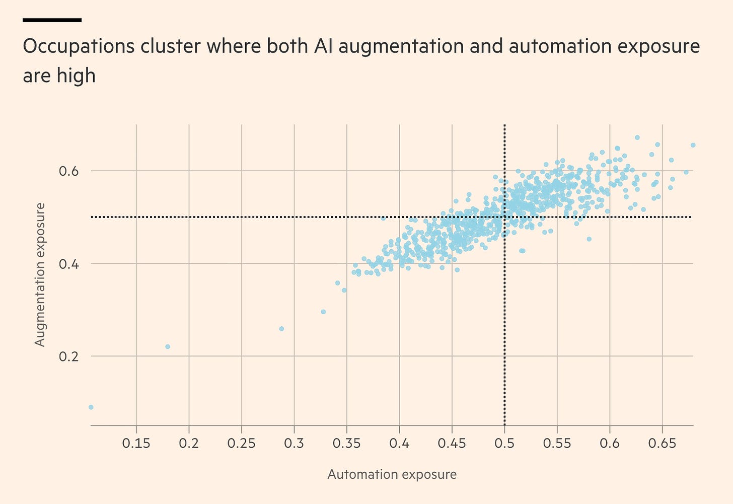 Indeed, this connects with a great read, from FT’s Tej Parikh, which made a critical observation that cuts through the noise: the AI job-apocalypse narrative confuses correlation with causation.