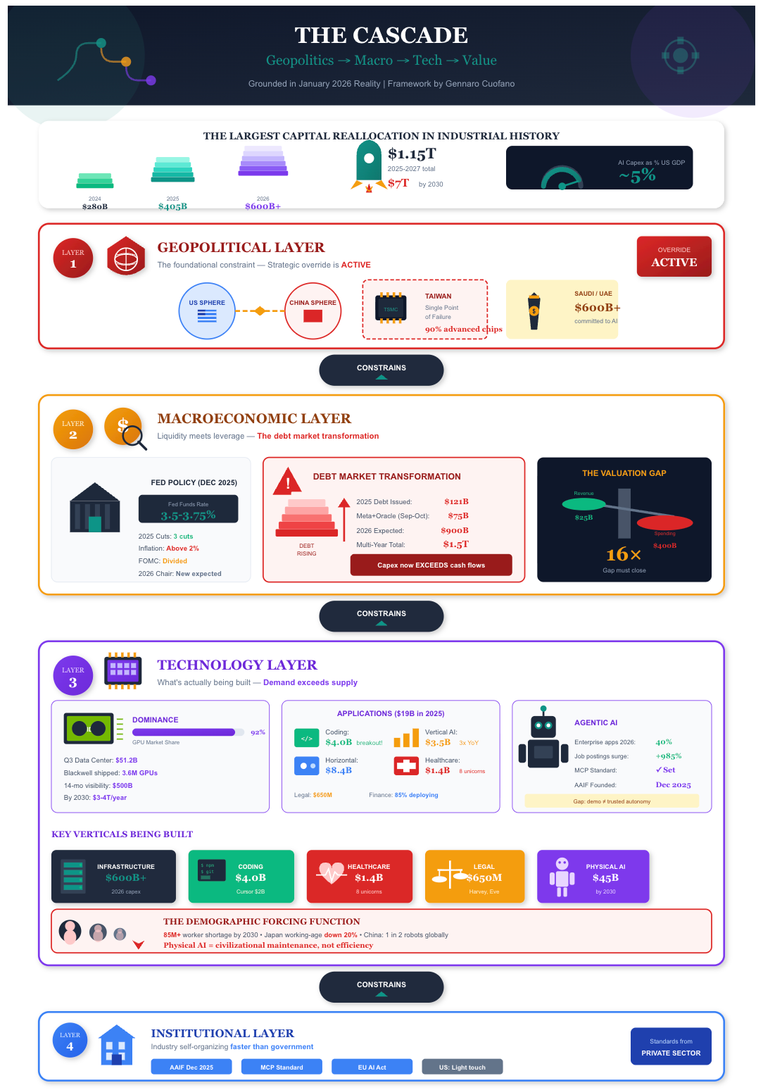 But geopolitics doesn’t exist in isolation; it cascades downward through macroeconomic conditions and into technology dynamics, creating a unified analytical framework where each layer constrains the next.