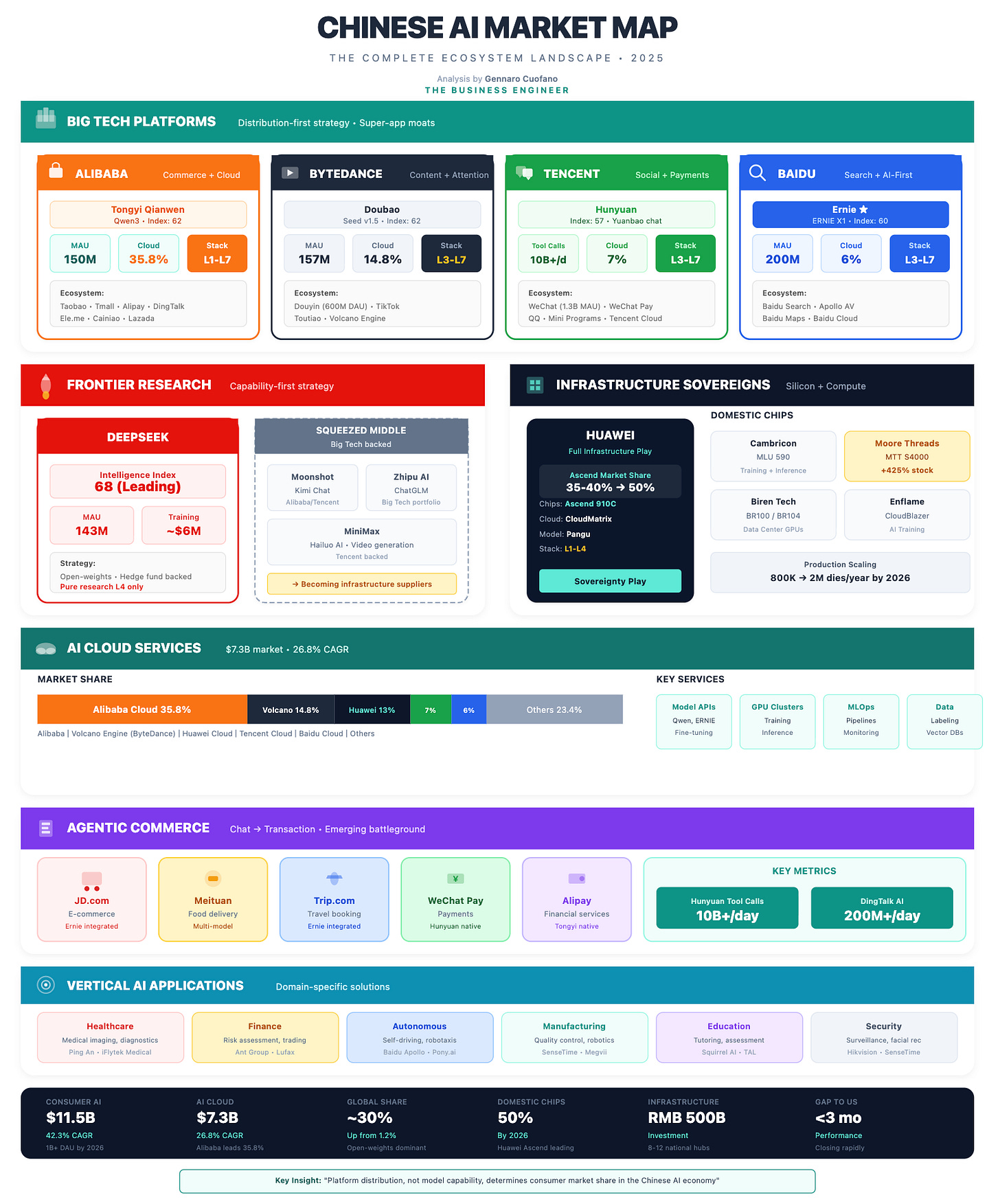 The Chinese AI economy has emerged as a vertically integrated ecosystem where platform distribution—not model capability—determines consumer market share. This report provides a comprehensive analysis of the market architecture, competitive dynamics, and strategic implications for investors, enterprise leaders, startups, and policymakers.