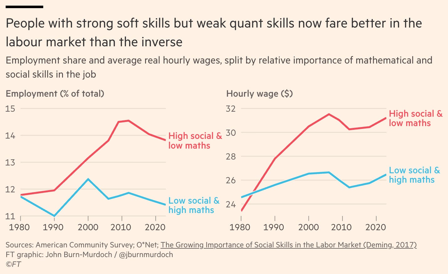 The Financial Times chart reveals a structural shift that most analysts misread. The conventional interpretation: “social skills matter now.” The deeper insight: the labor market is rewarding cognitive range—the ability to operate across levels of abstraction without friction.