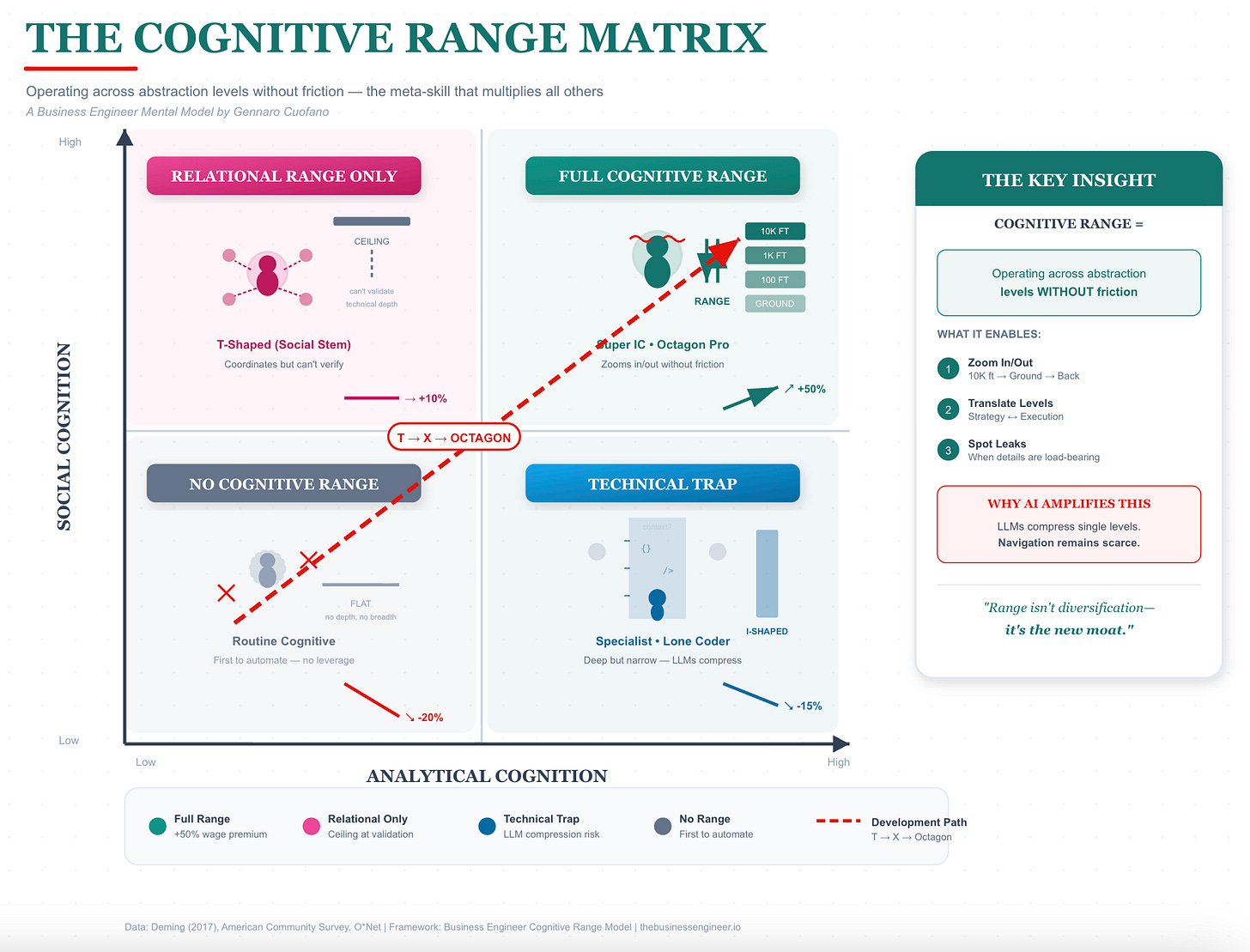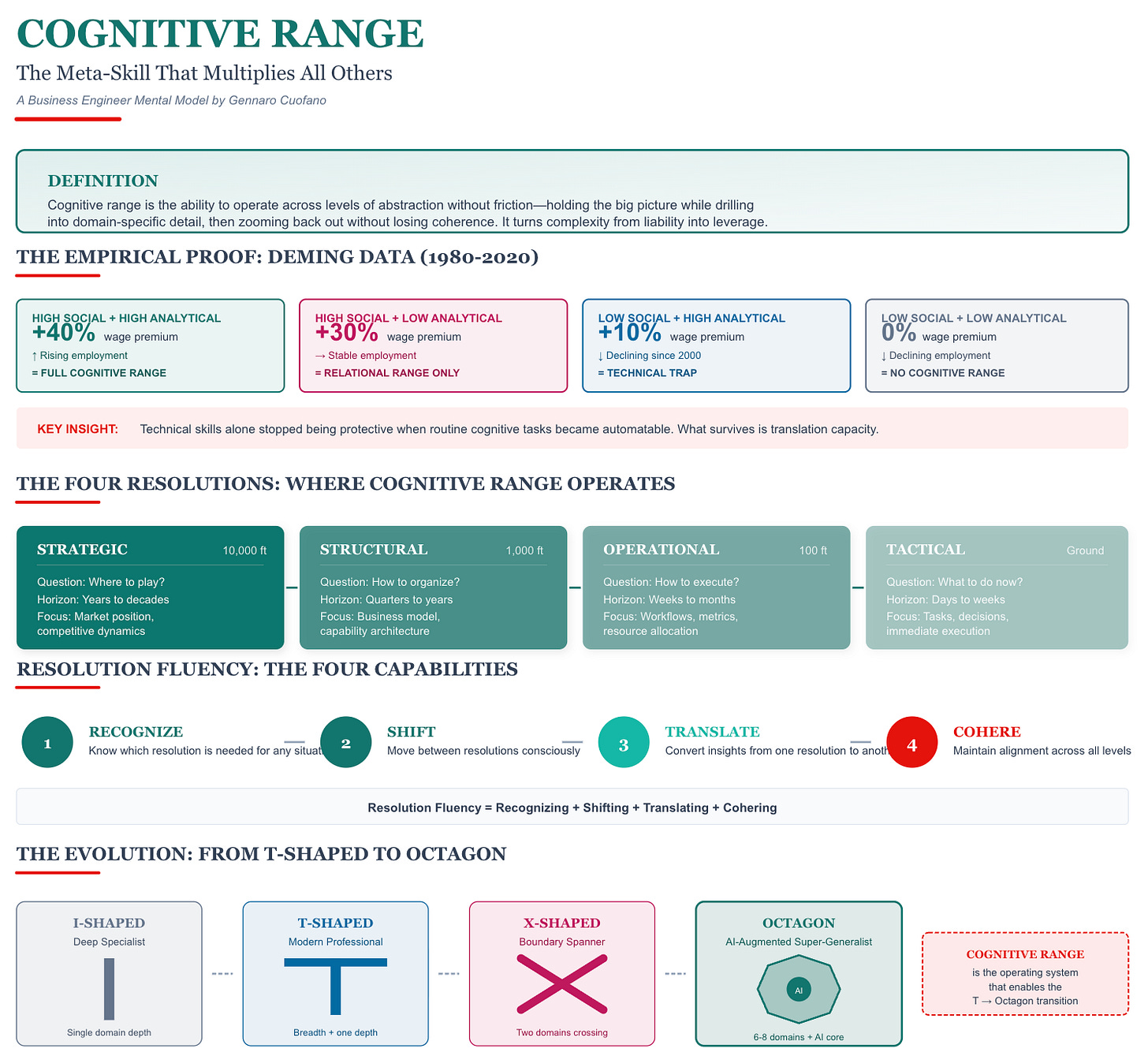 Cognitive range is the ability to operate across levels of abstraction without friction. It means holding the big picture in your head while drilling into domain-specific detail when needed, then zooming back out without losing coherence.