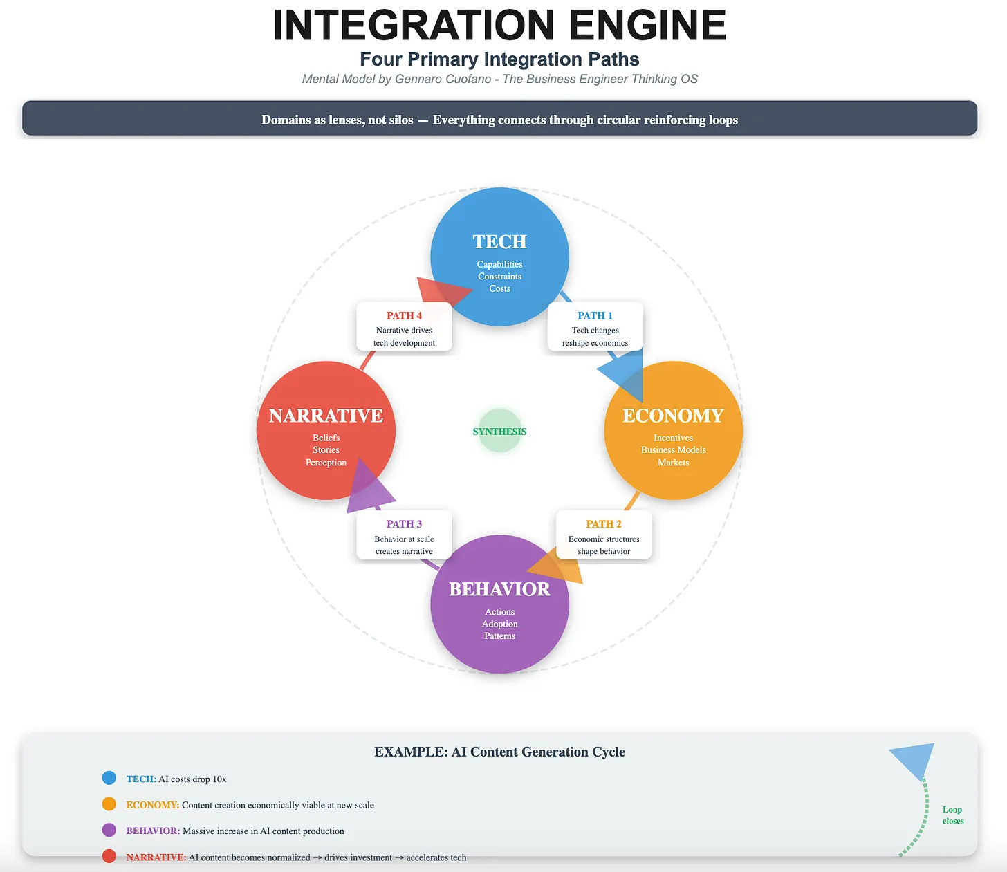 Value isn’t in knowing more, it’s in seeing how everything fits together. The Integration Engine constantly synthesizes across domains: a micro-observation connects to macro themes.