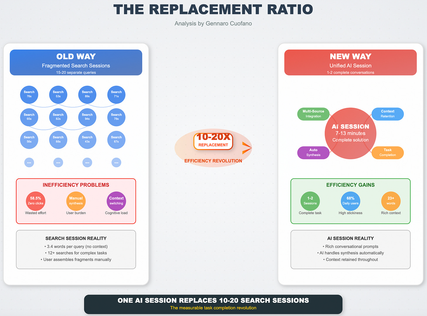 Estimated 10–20x replacement ratio (one AI session replaces dozens of searches).