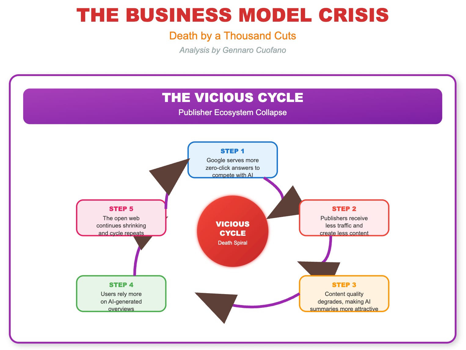 More zero-click results → publishers earn less → content quality degrades → AI overviews look better → reliance on AI grows.