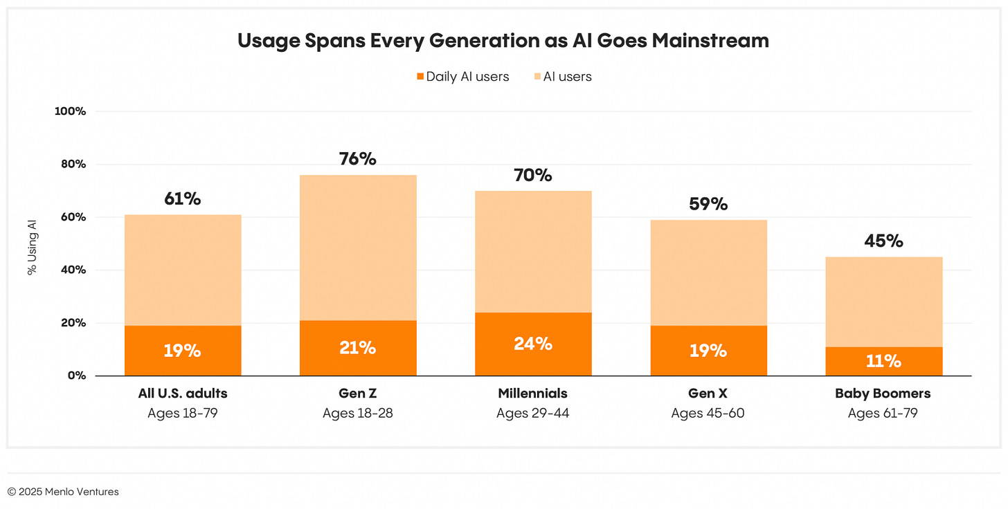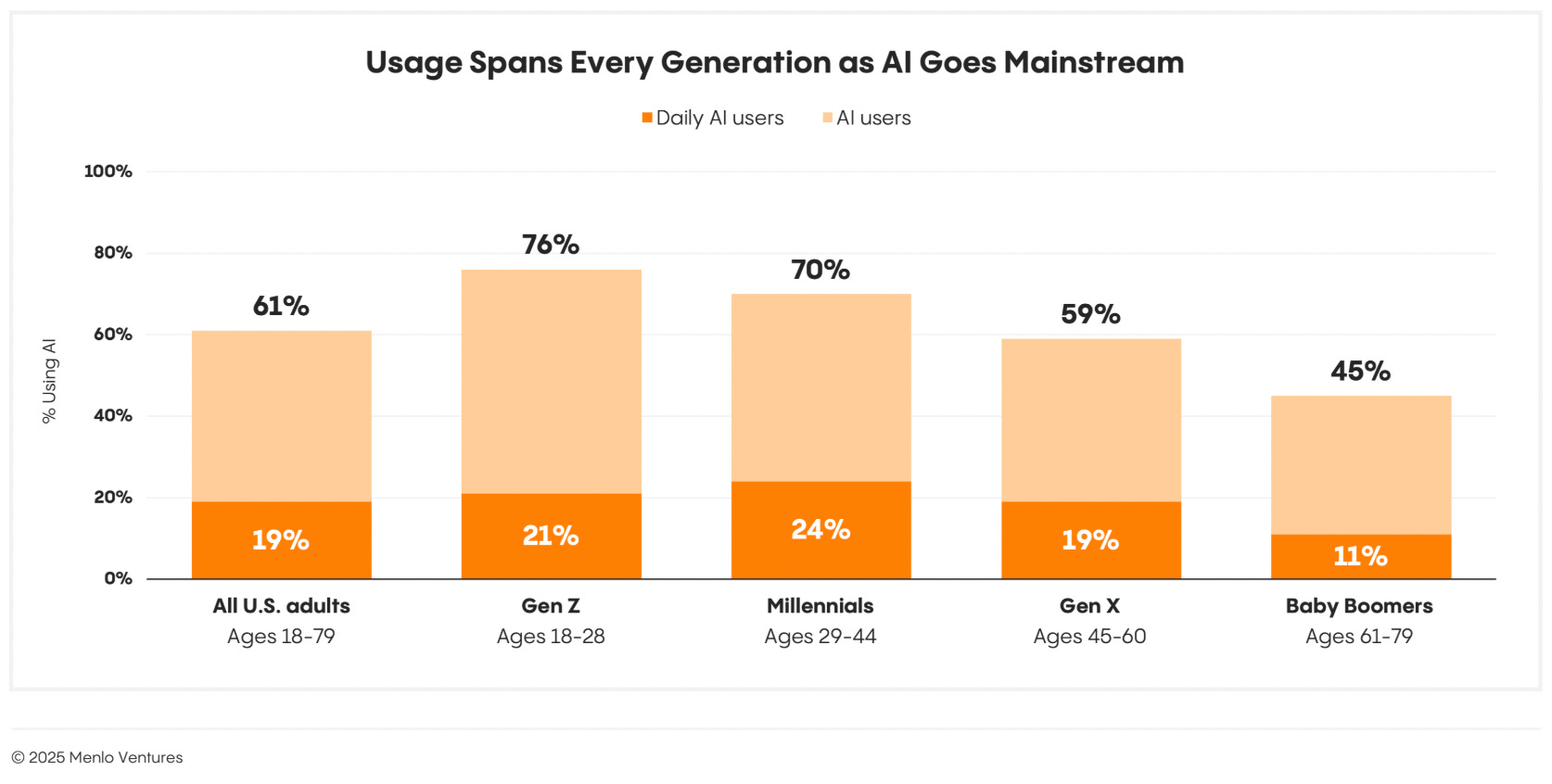 This isn't adoption slowing—it's generational replacement in progress. While Gen Z leads overall AI adoption as expected, Millennials (ages 29-44) emerge as power users, reporting more daily usage—flipping the typical "younger = higher usage" pattern, as reported by Menlo Ventures.