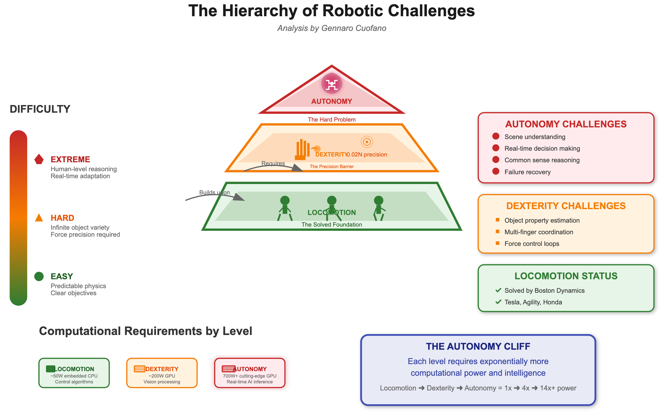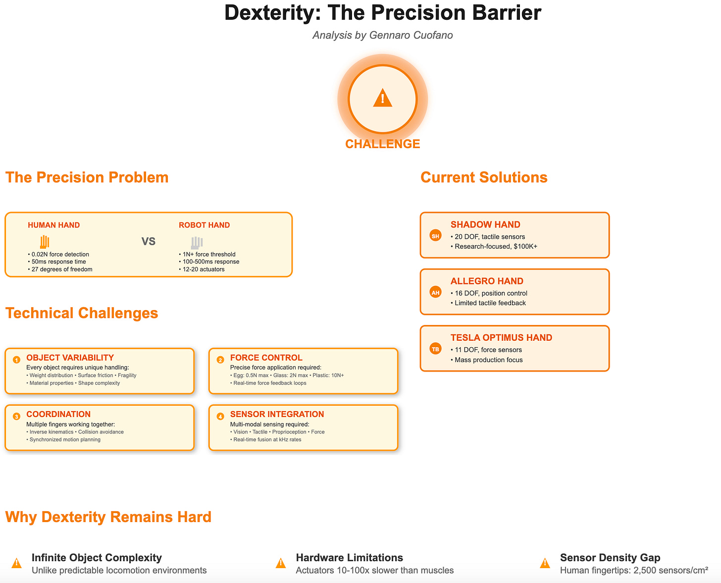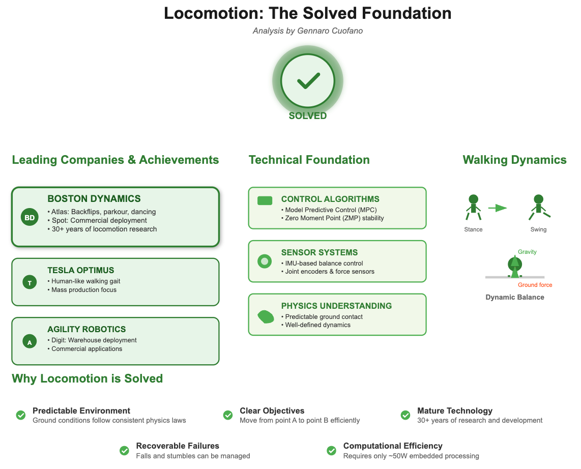 Locomotion, while visually impressive, has become the most tractable aspect of advanced robotics. Boston Dynamics' Atlas can now perform parkour, and humanoid robots from companies like Agility and Tesla demonstrate increasingly fluid walking gaits. This success stems from locomotion being fundamentally a constrained optimization problem: