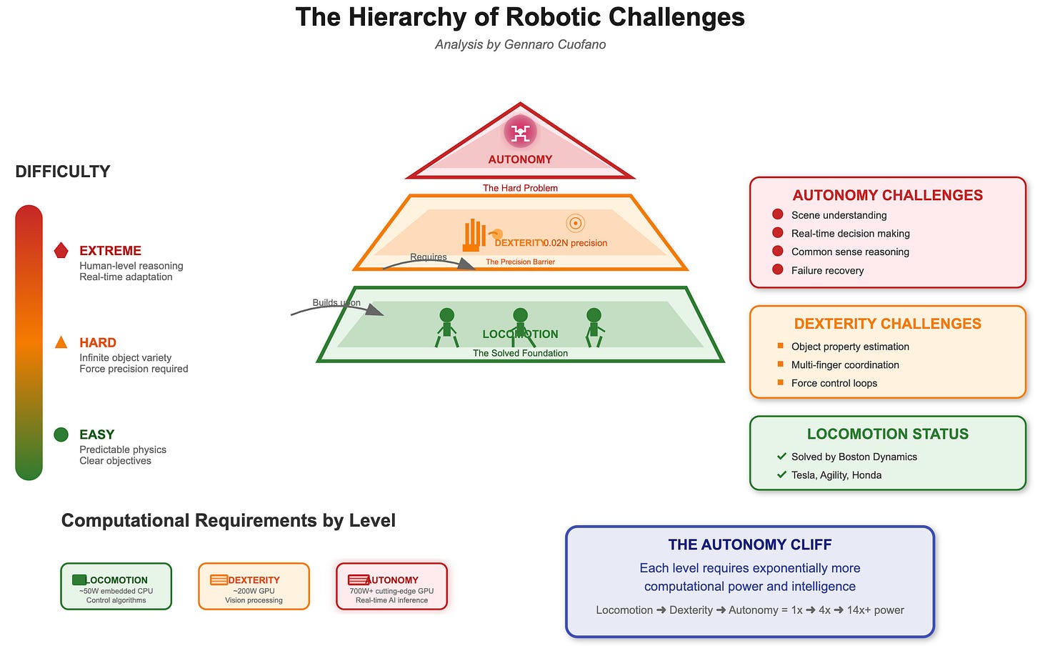 The technological stack for locomotion is relatively mature, featuring IMU-based balance control, model predictive control algorithms, and sophisticated joint actuators that have reached a sufficient capability for most terrestrial environments.