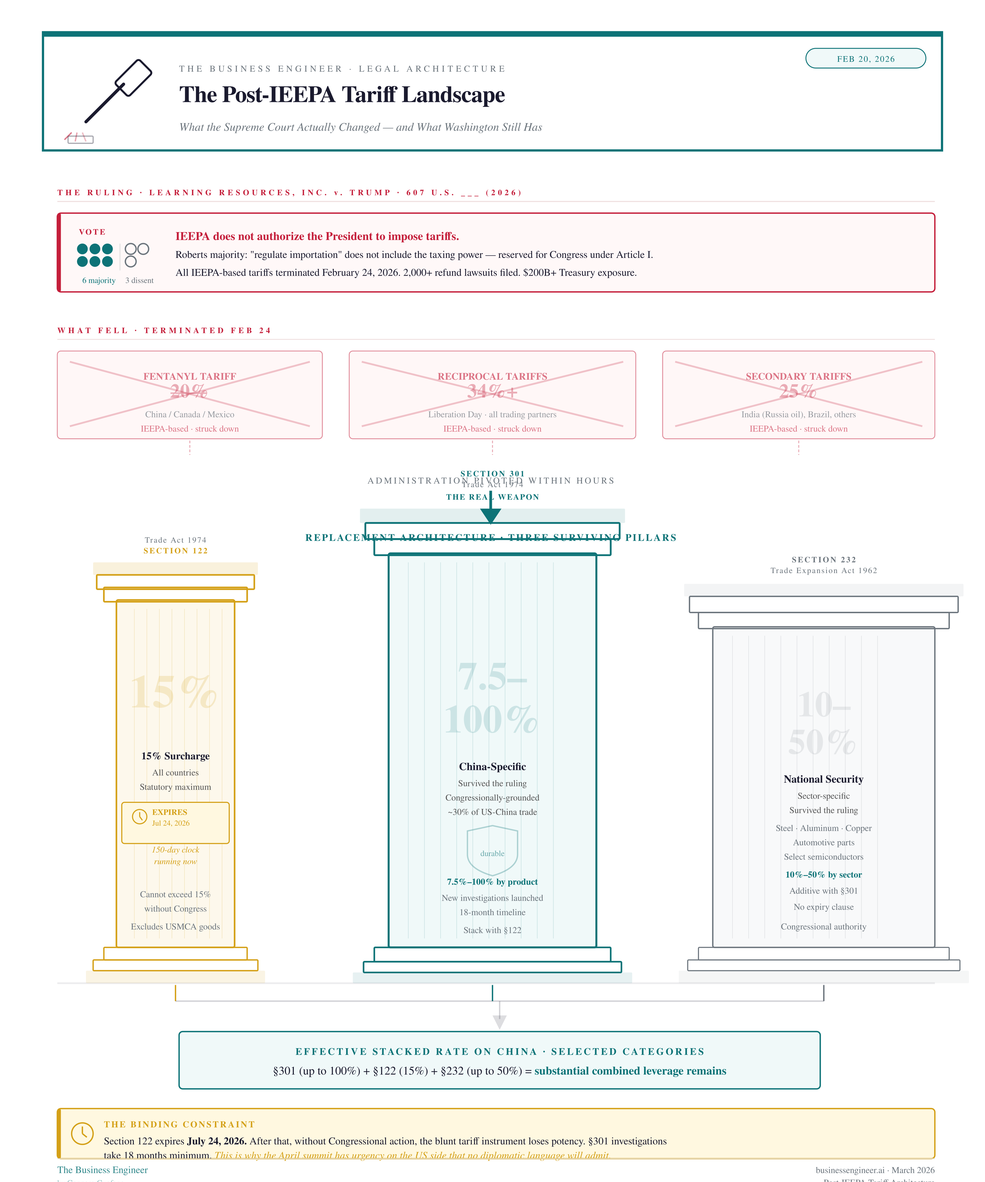 Section 301 (Trade Act 1974): China-specific. Survived ruling. Product-specific rates of 7.5–100% covering ~30% of US-China trade. New Section 301 investigations announced — 12–18 month timeline to new tariffs.