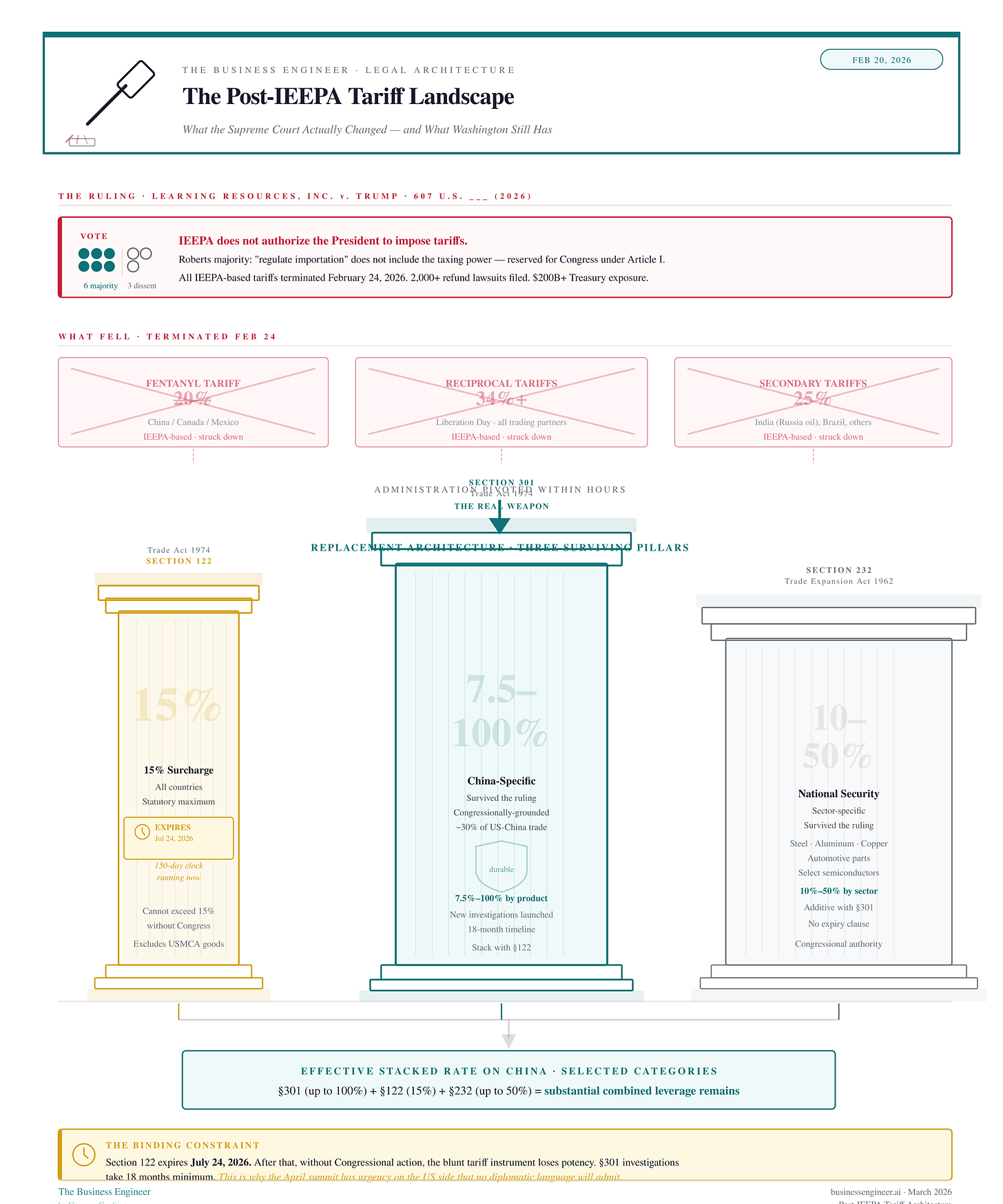 The immediate effect on China: The 20% fentanyl tariff — gone. The 34%+ reciprocal tariff — gone. Over $200 billion in IEEPA tariffs paid by importers are now in legal jeopardy, with 2,000+ refund lawsuits filed. The effective tariff rate on Chinese goods collapsed significantly, giving Beijing a genuine opening ahead of the summit.