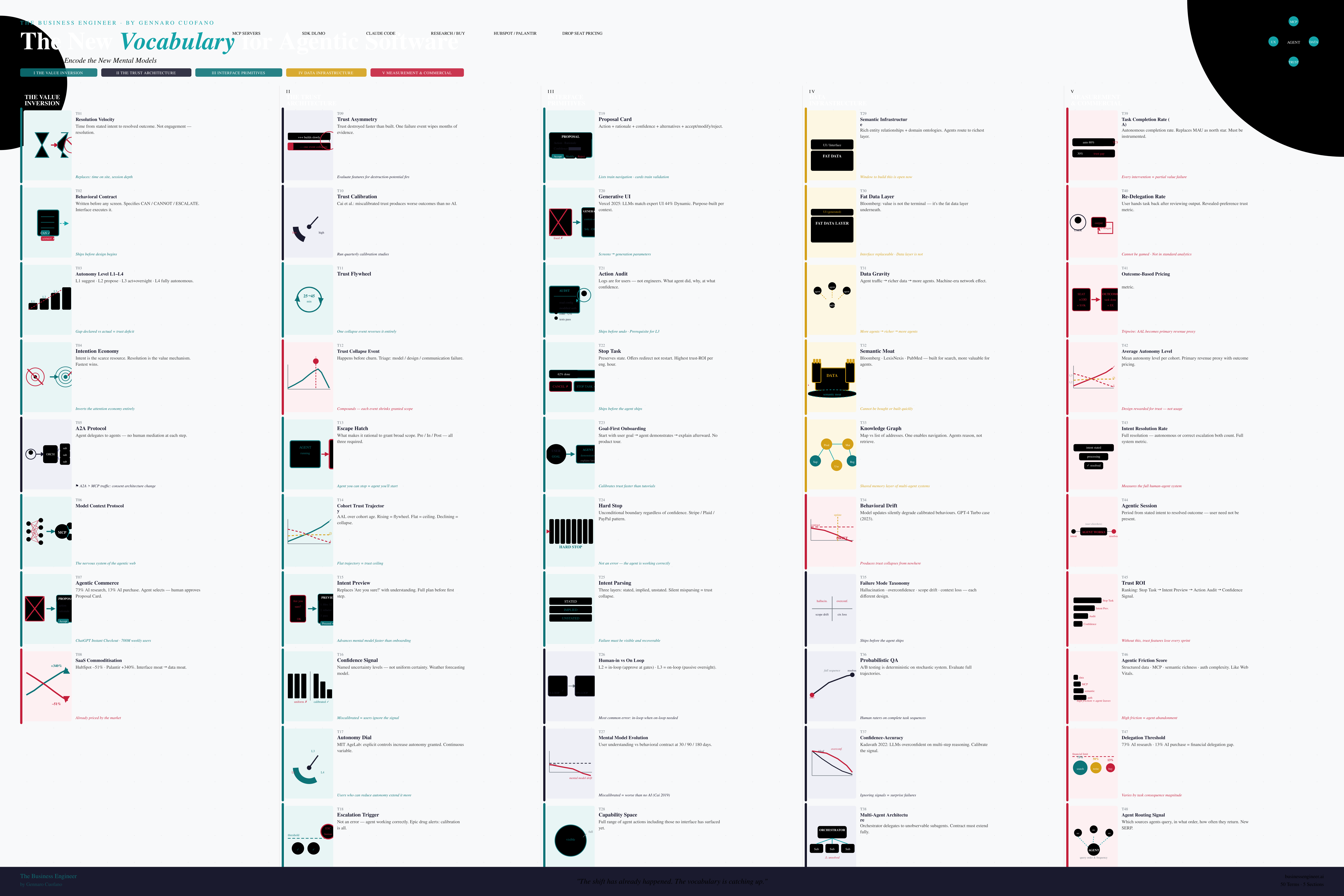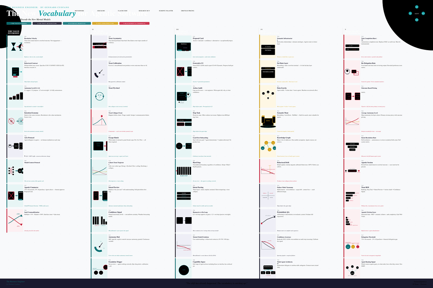 The fifty terms that follow are organised into five clusters: the shift in what the product optimises for; the architecture of trust between human and agent; the interface primitives that make trust legible; the infrastructure that makes agents possible; and the measurement and commercial vocabulary that maps agentic value onto business outcomes.