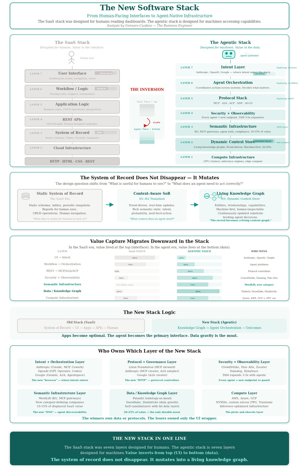 The SaaS stack was a seven-layer stack designed for humans navigating software. The agentic stack is a fundamentally different architecture designed for machines executing outcomes. This is not an incremental upgrade — it is a structural inversion of where value lives, how it flows, and who captures it.