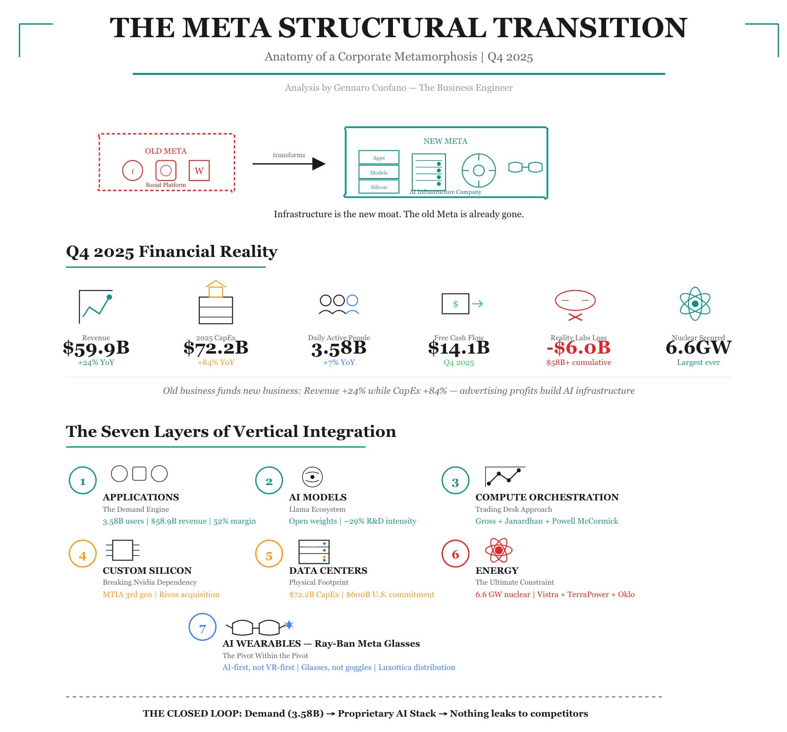 This analysis examines the full scope of Meta’s transition: the strategic logic, the pieces being assembled, the open questions, and the potential futures. We look beyond any single announcement to understand the structural shift underway — from a social platform that uses AI to something far more vertically integrated and infrastructurally rooted.