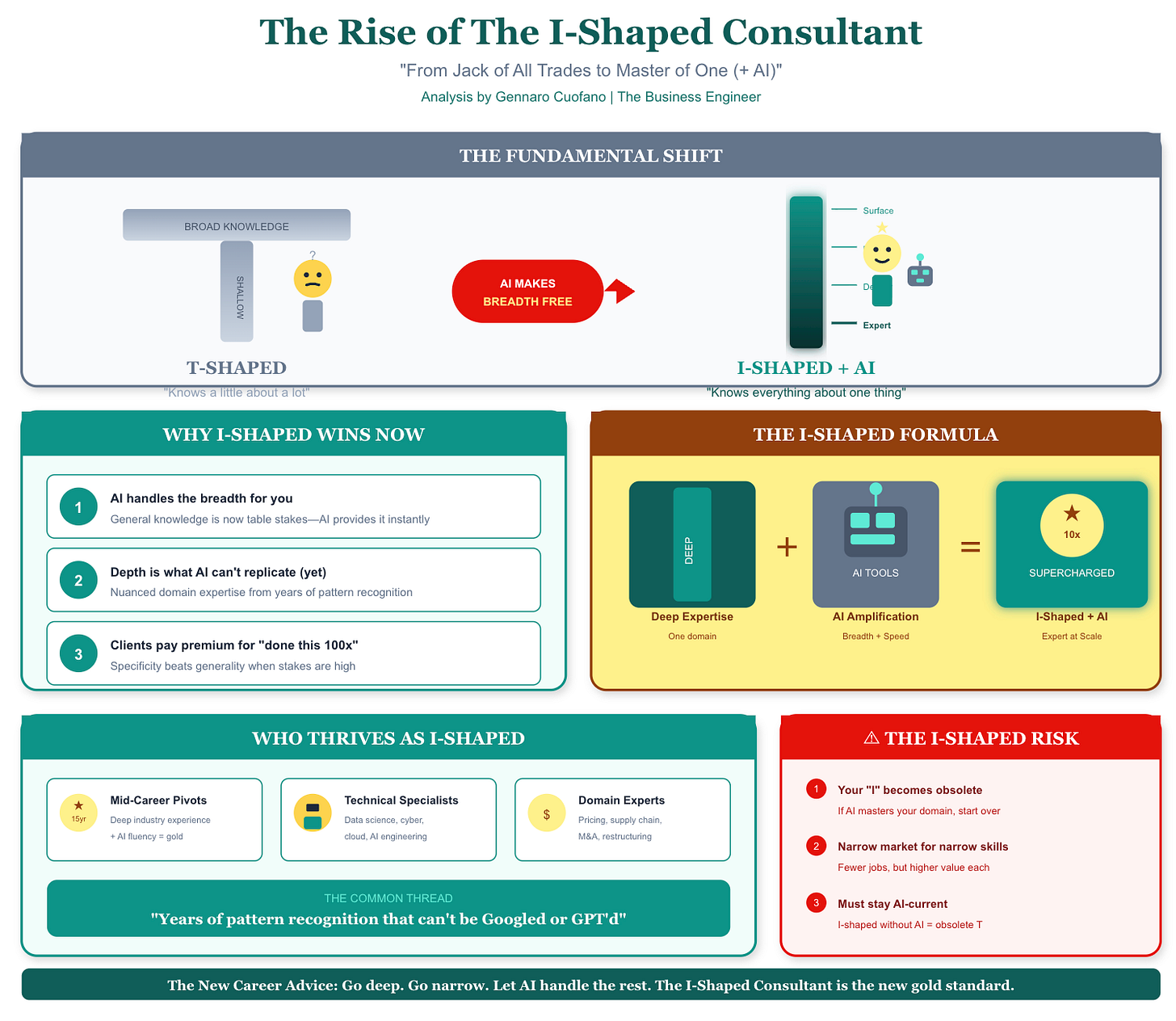 The arrival of AI hasn’t just changed what consultants do—it has fundamentally altered what kind of consultant the market rewards. The T-shaped generalist, once the industry’s ideal, is rapidly becoming its most vulnerable species. In its place, a new archetype is emerging: the I-shaped consultant.