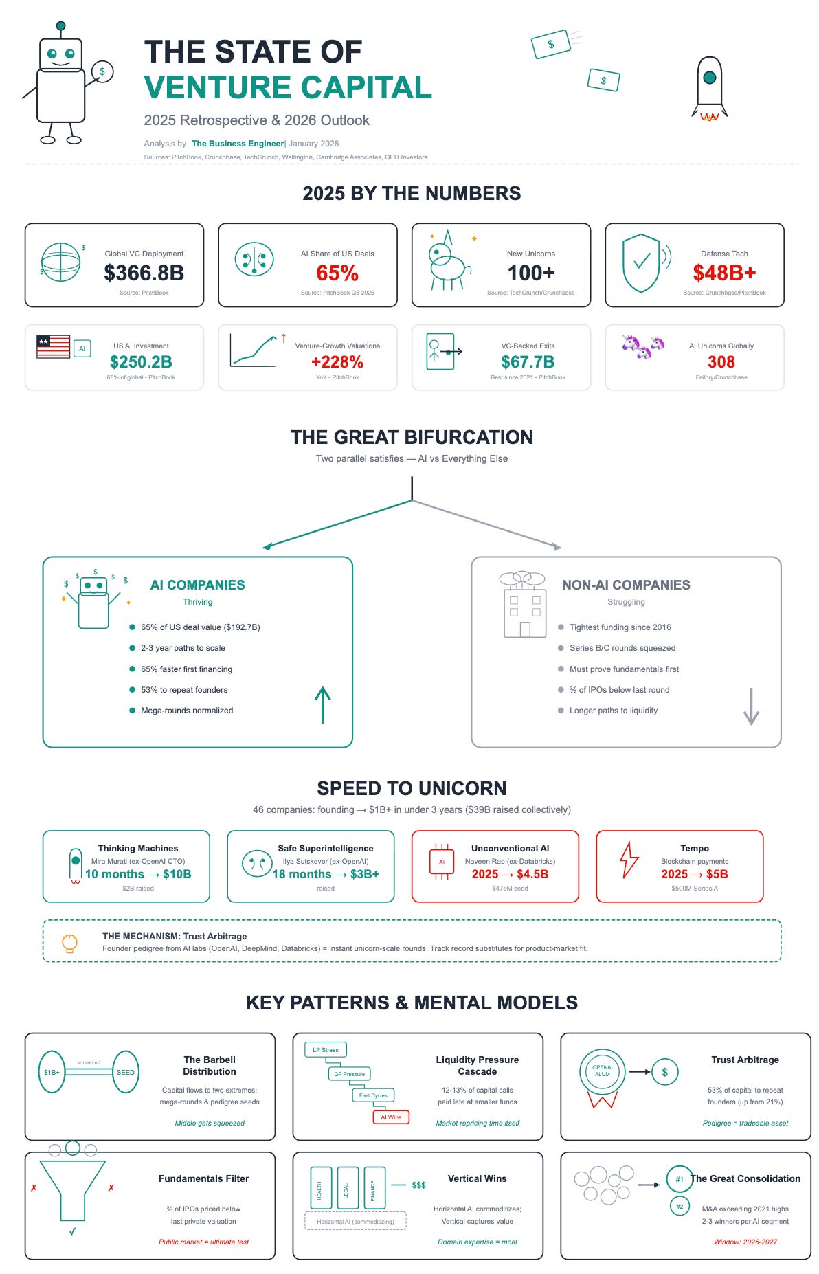 The mechanism: compressed time-to-scale in AI combined with LP pressure for liquidity created a structural preference for fast-cycle investments. 2026 brings continued AI dominance, the reopening of the IPO window (68 projected IPOs), and a “fundamentals-first” filter that will separate durable platforms from transient ones.