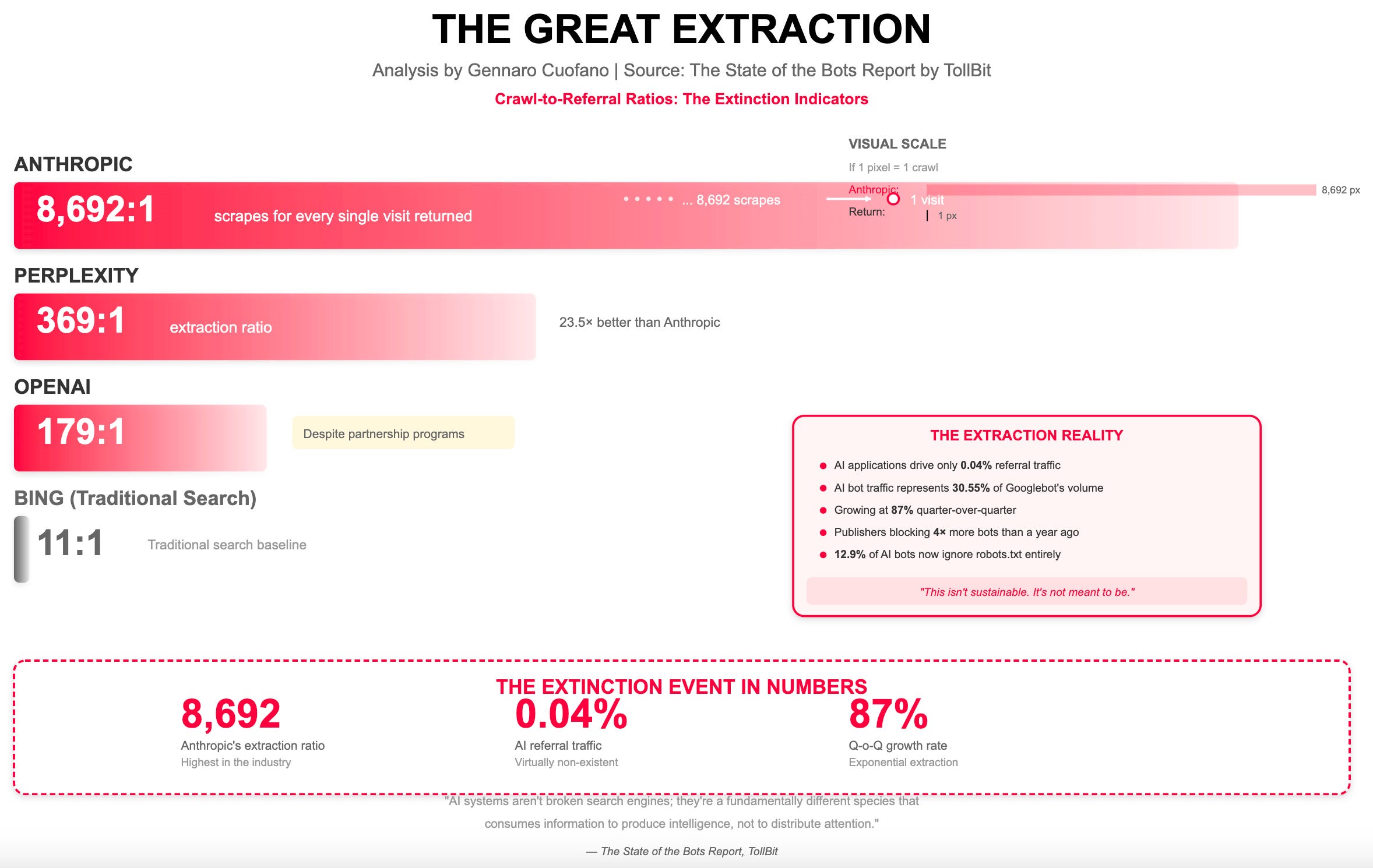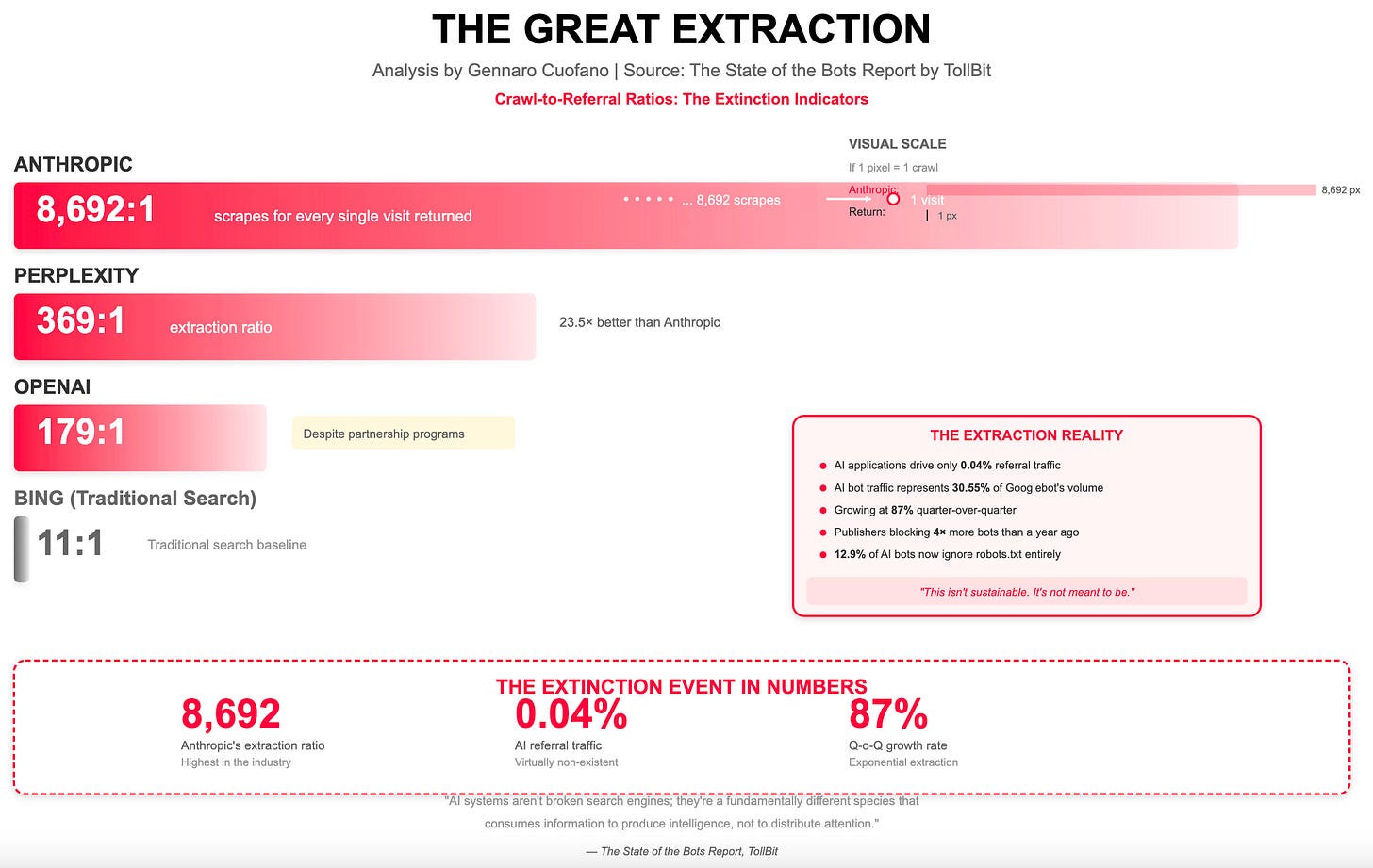 The numbers are devastating, AI applications drive a mere 0.04% of referral traffic back to publishers while consuming their content at unprecedented scales. This isn't a disruption; it's an extinction event.
