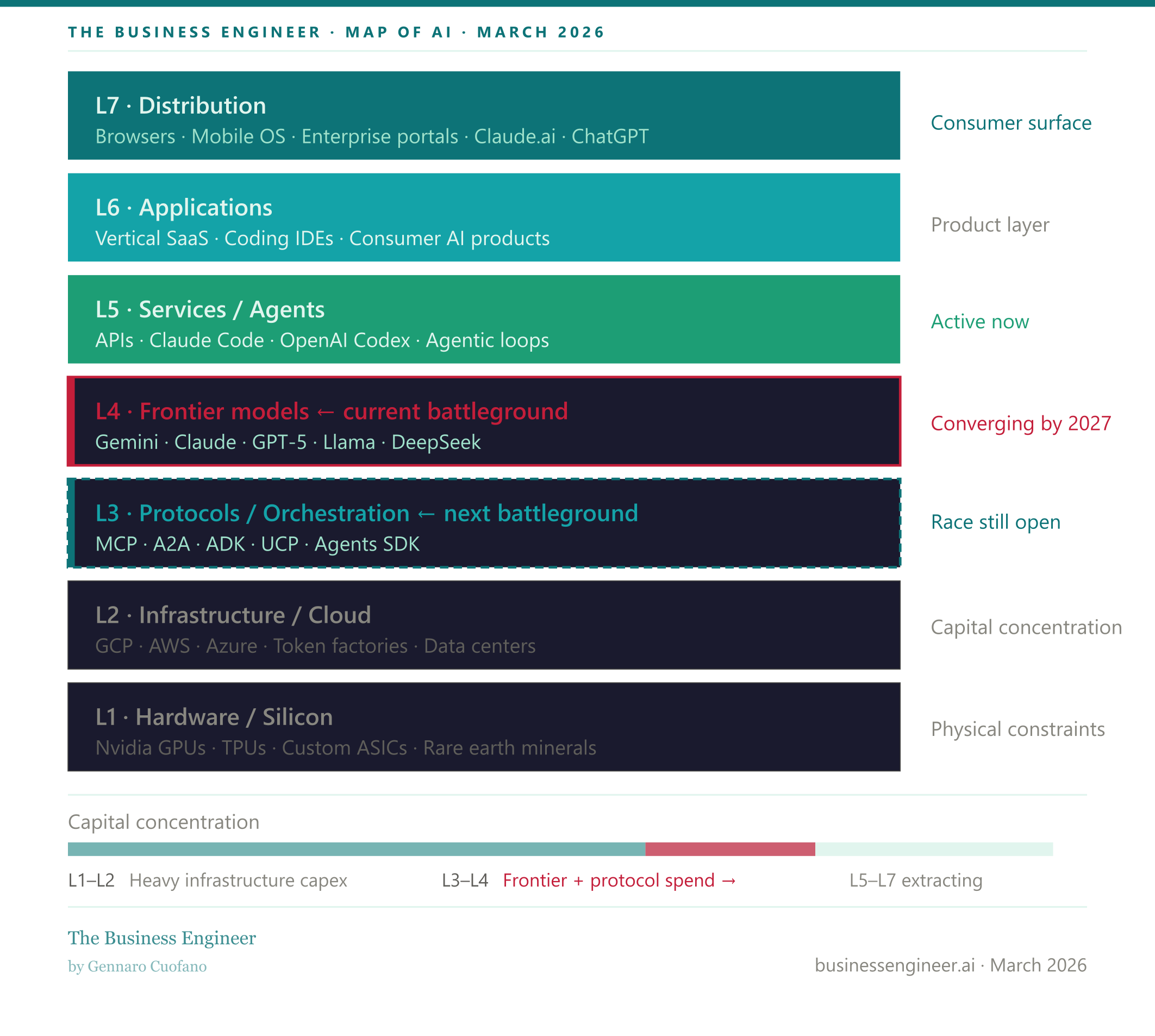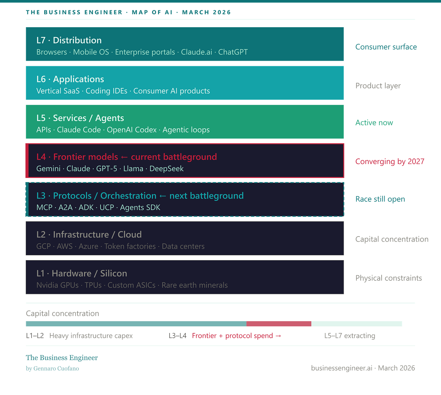 From the bottom up: hardware and silicon, infrastructure and cloud, platforms and protocols, frontier models, services and agents, applications, and distribution.