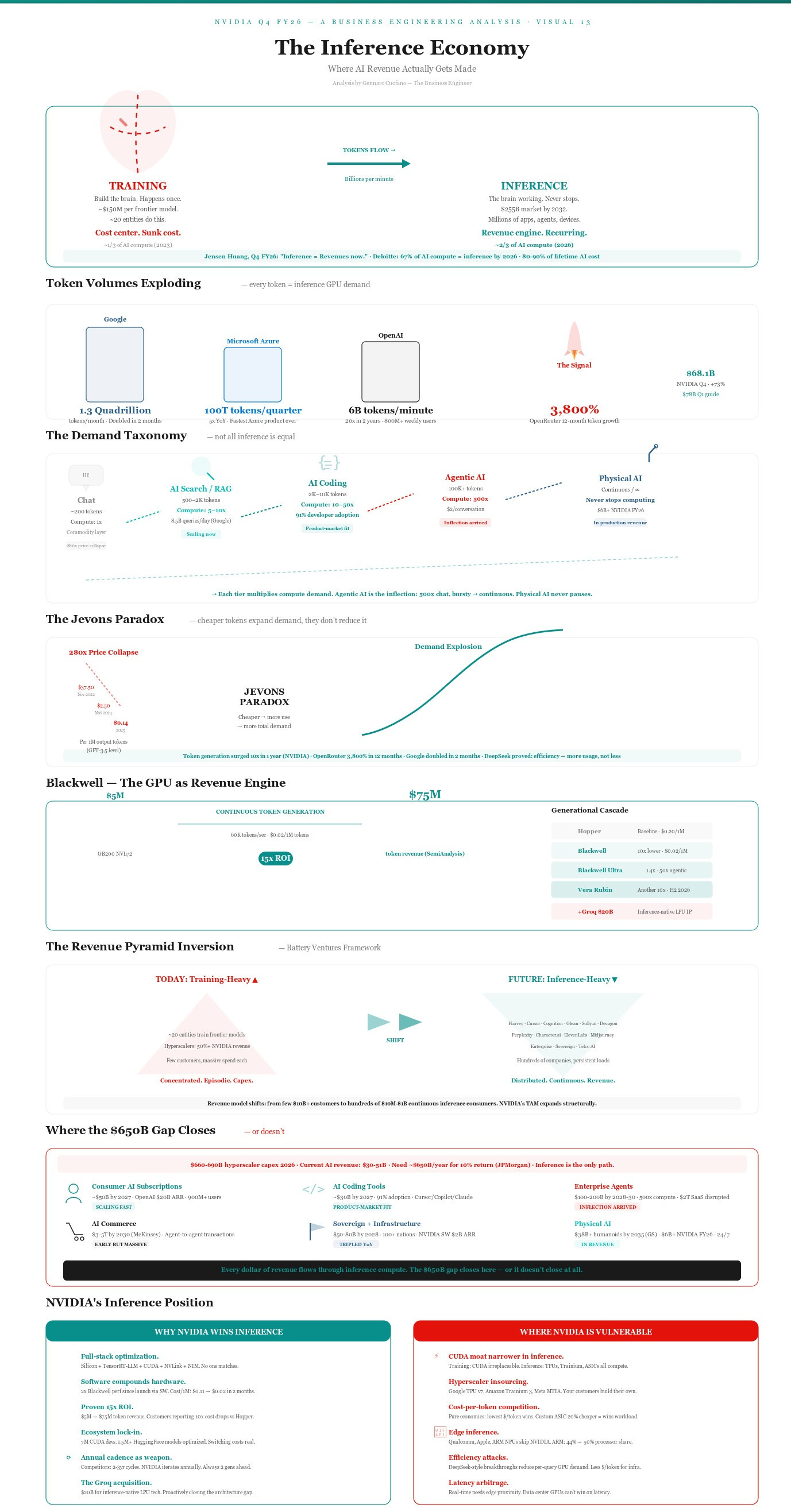Training was a cost center: episodic, concentrated among roughly twenty frontier model labs, amortizable across trillions of tokens. Inference is a revenue engine: continuous, distributed across millions of applications and agents, incurring marginal cost with every query. Training builds the brain. Inference is the brain working. And the AI brain never sleeps.