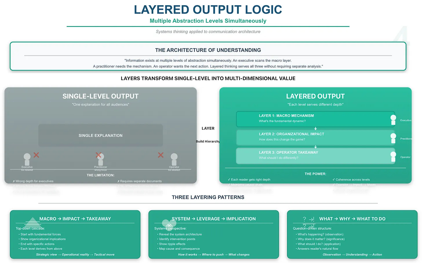 The analyst needs methodology and edge cases. Layered output logic delivers all three simultaneously without dilution, each layer serves its audience perfectly while building toward comprehensive understanding.