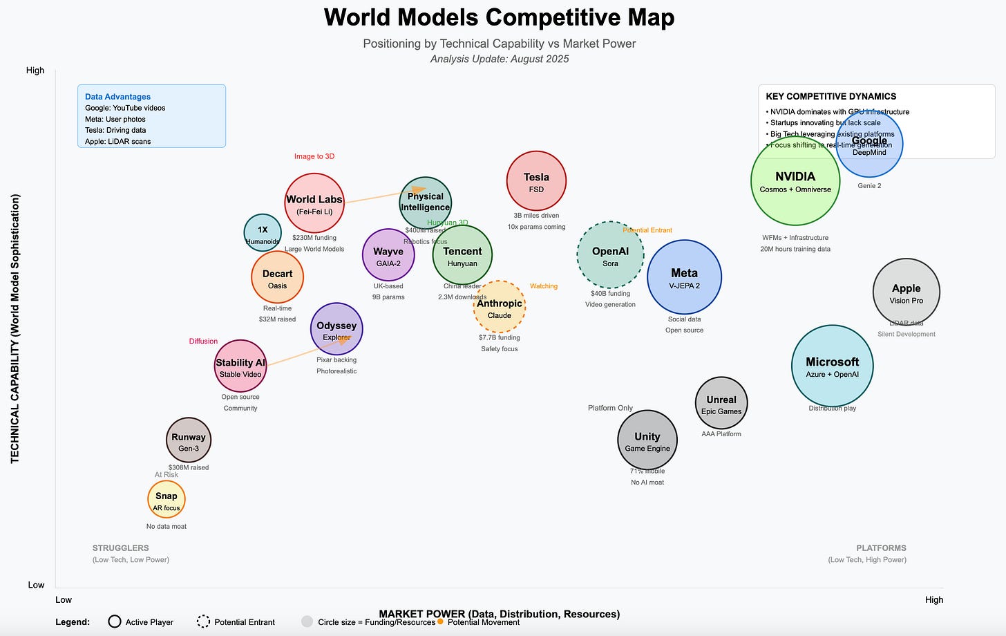 Our analysis reveals a market in rapid flux, where NVIDIA has emerged as the unexpected kingmaker, simultaneously providing the infrastructure everyone needs while building their own world models.