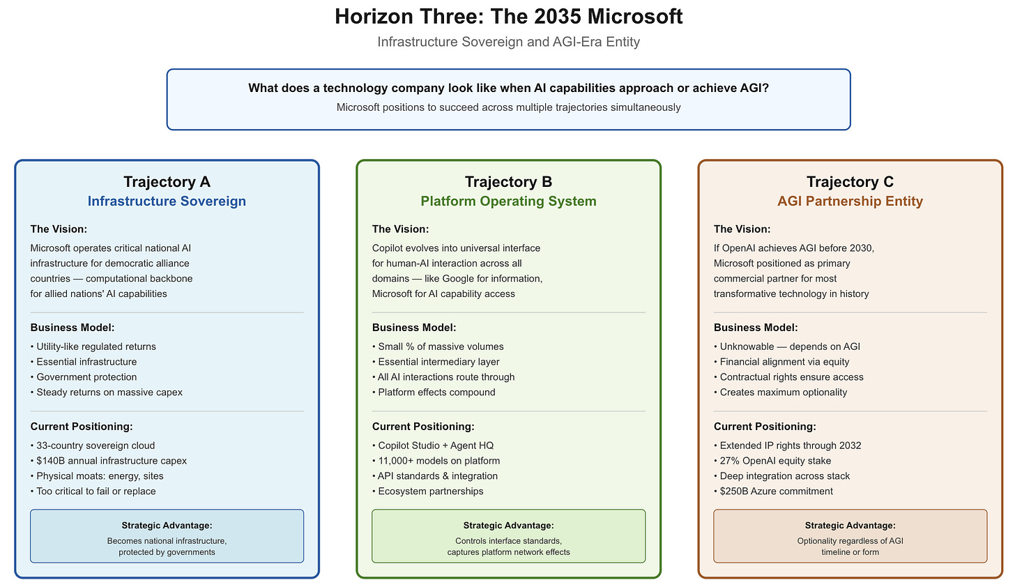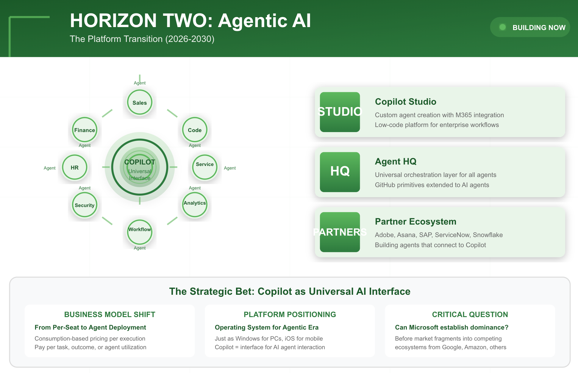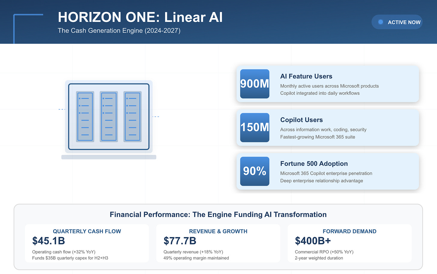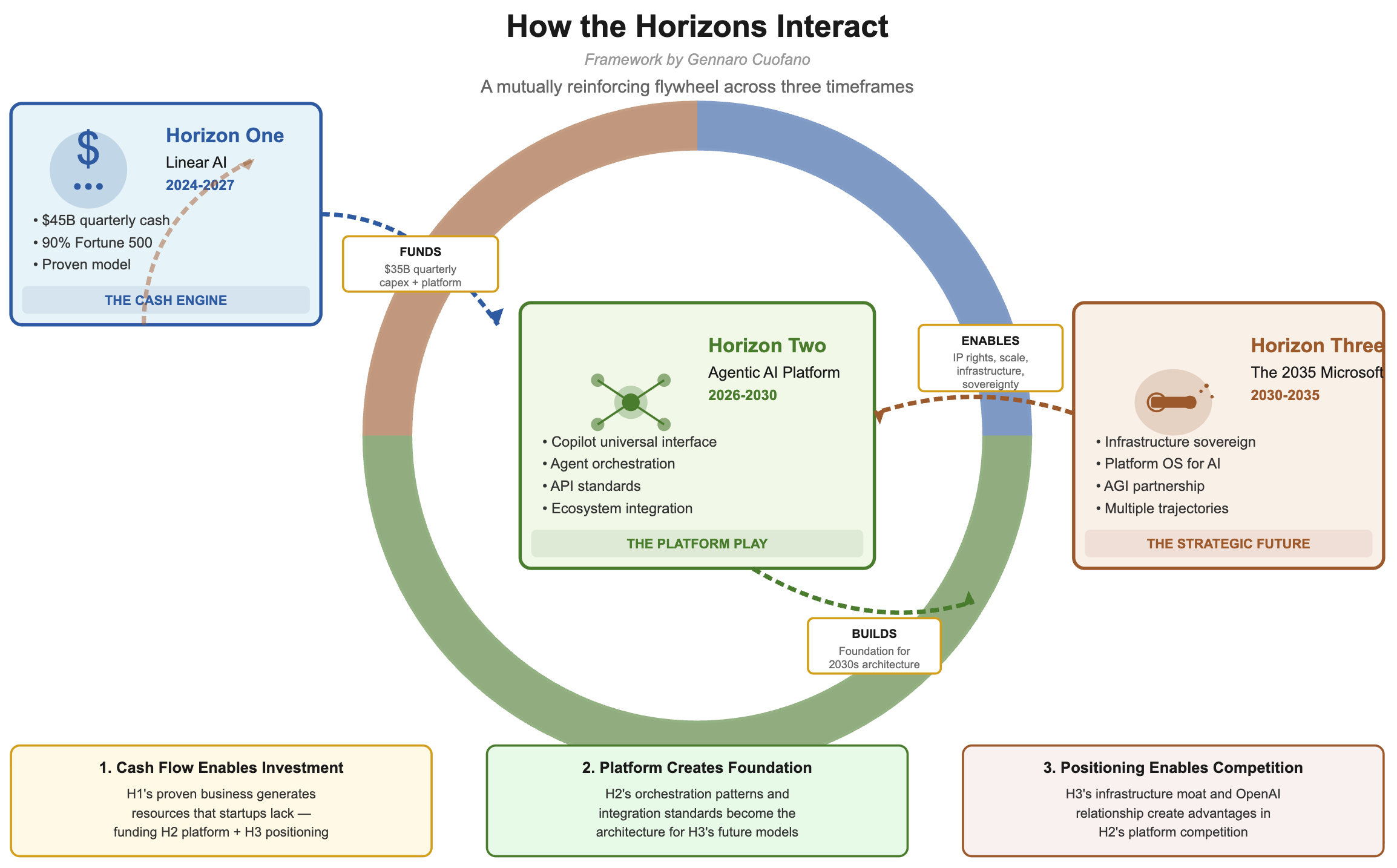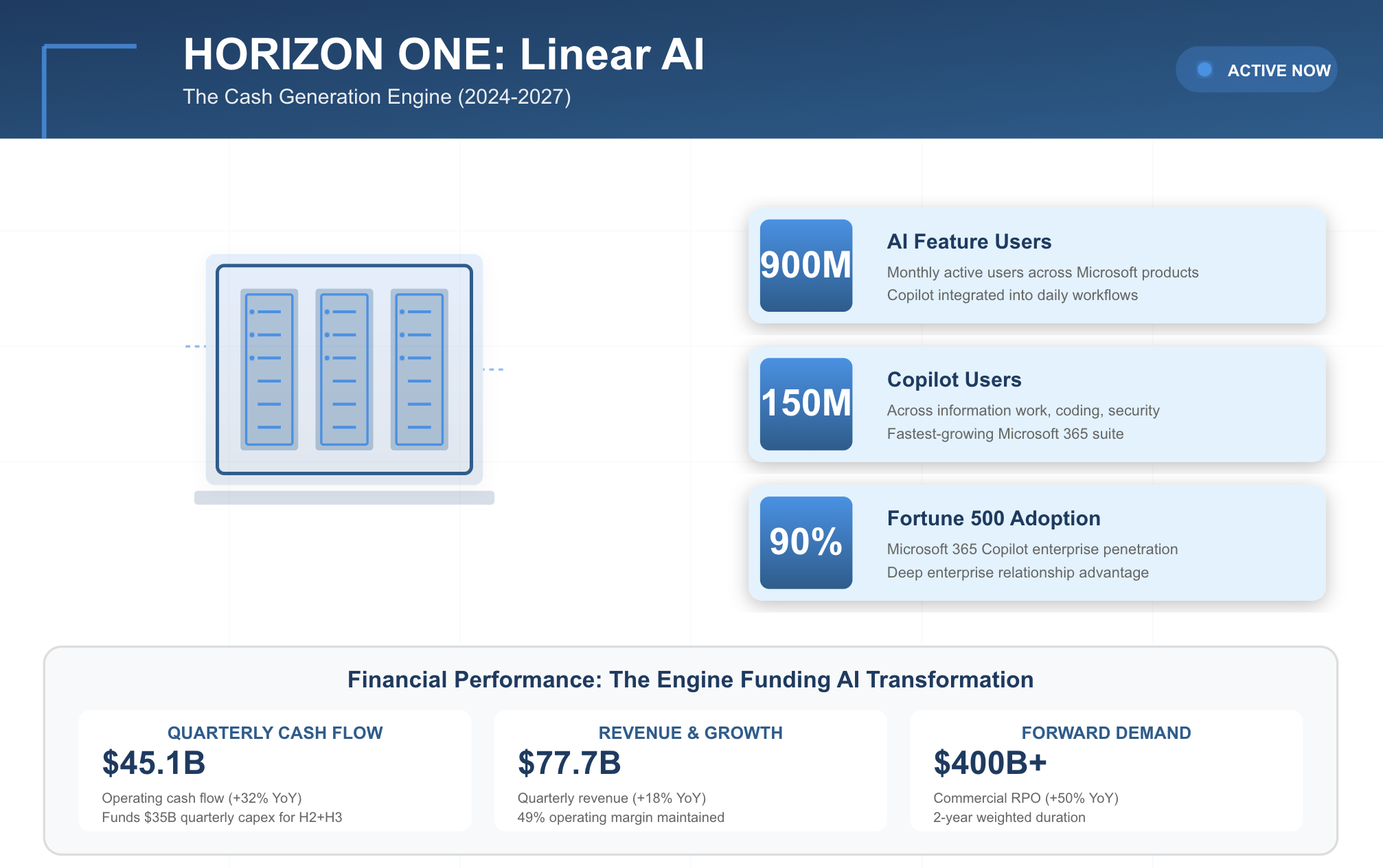 Three horizons executed in parallel: cash-generating linear AI, agent platform transition, AGI-era optionality.