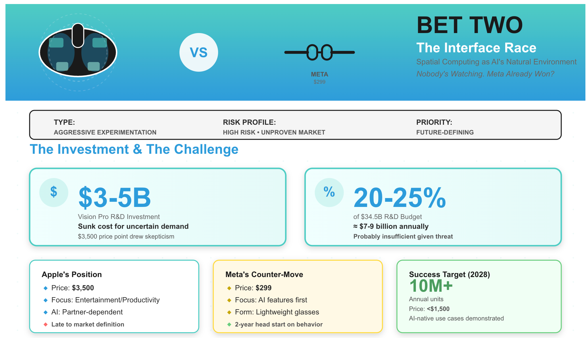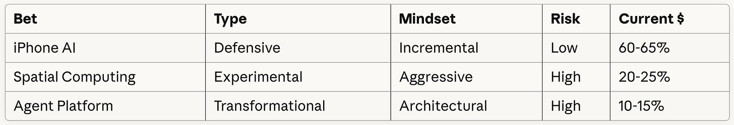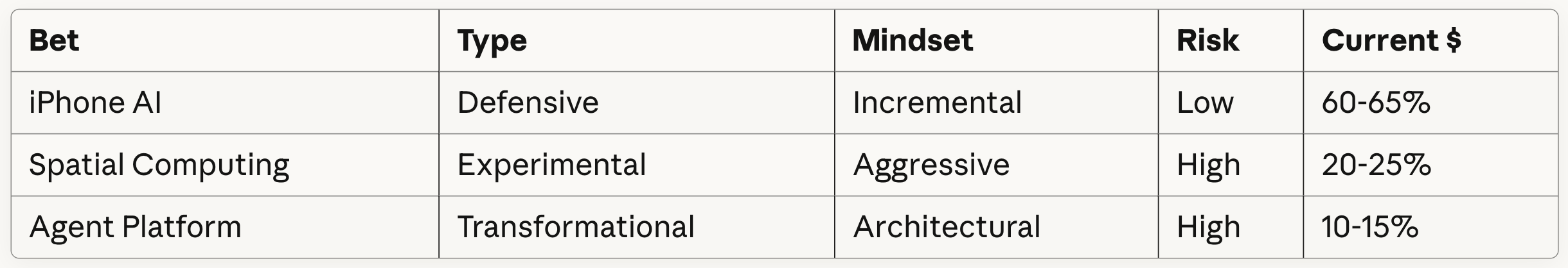 Three bets under resource tension: defend iPhone with on-device AI, spatial computing vs AI glasses, and an agent marketplace.