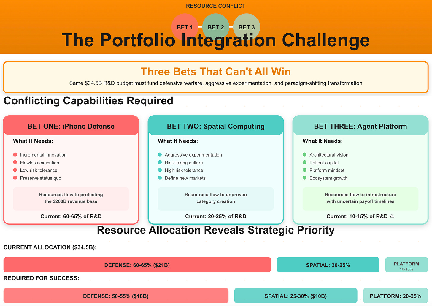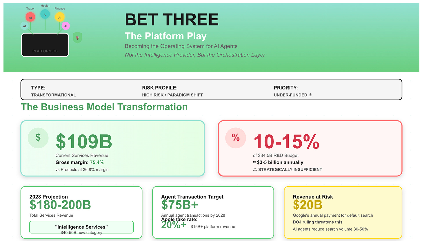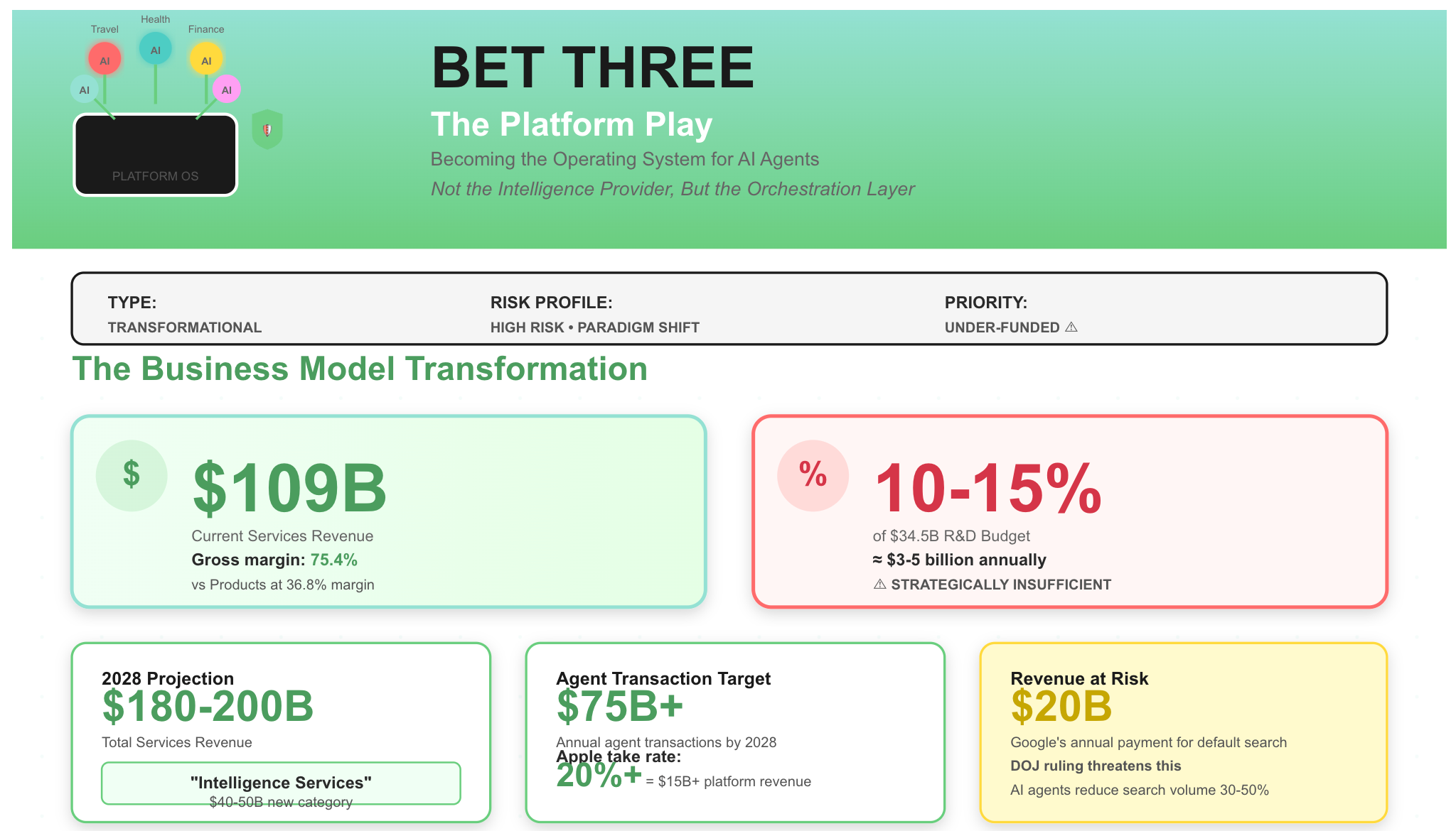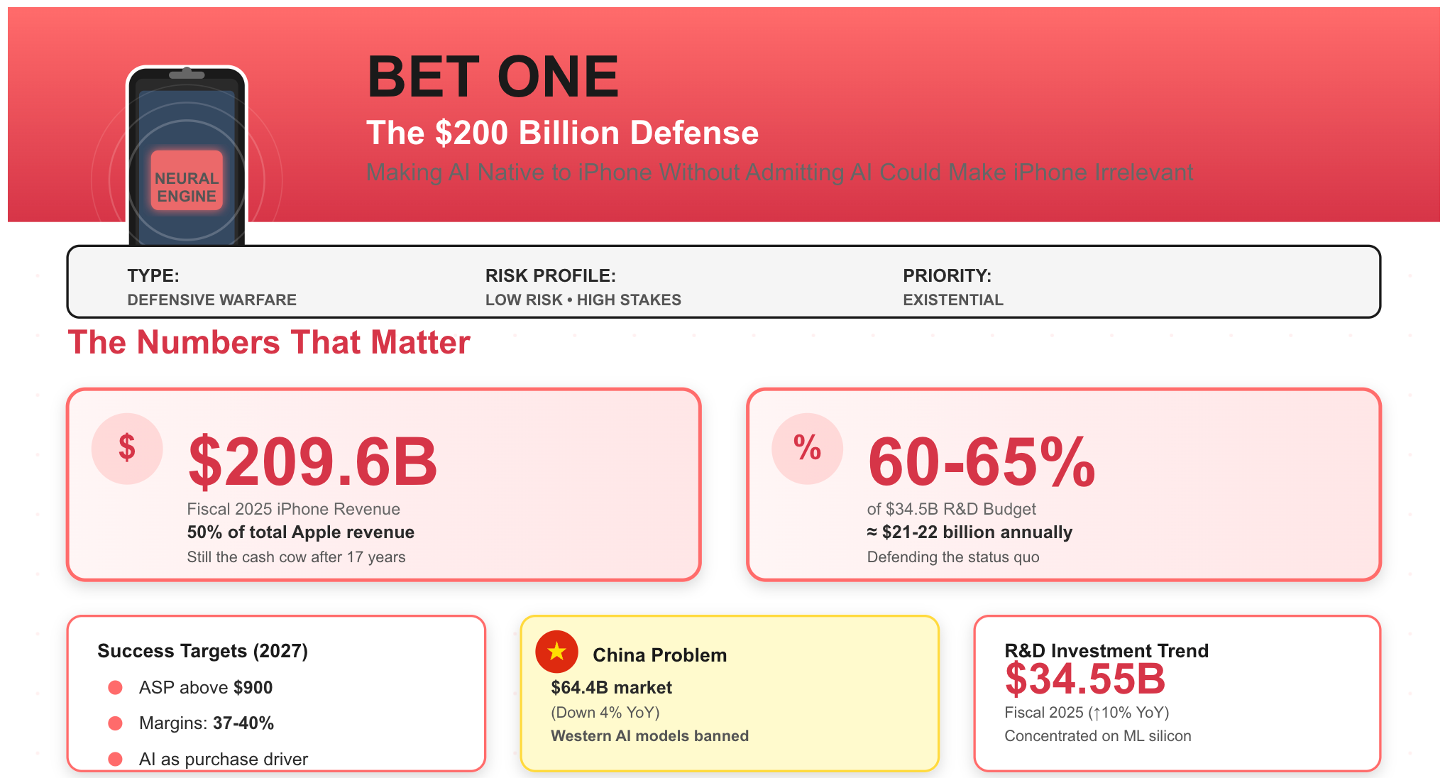 Core Thesis: Apple faces its most complex strategic moment in history—three massive, interconnected bets that will determine whether it remains the most valuable company or becomes an elegant footnote to the AI revolution.