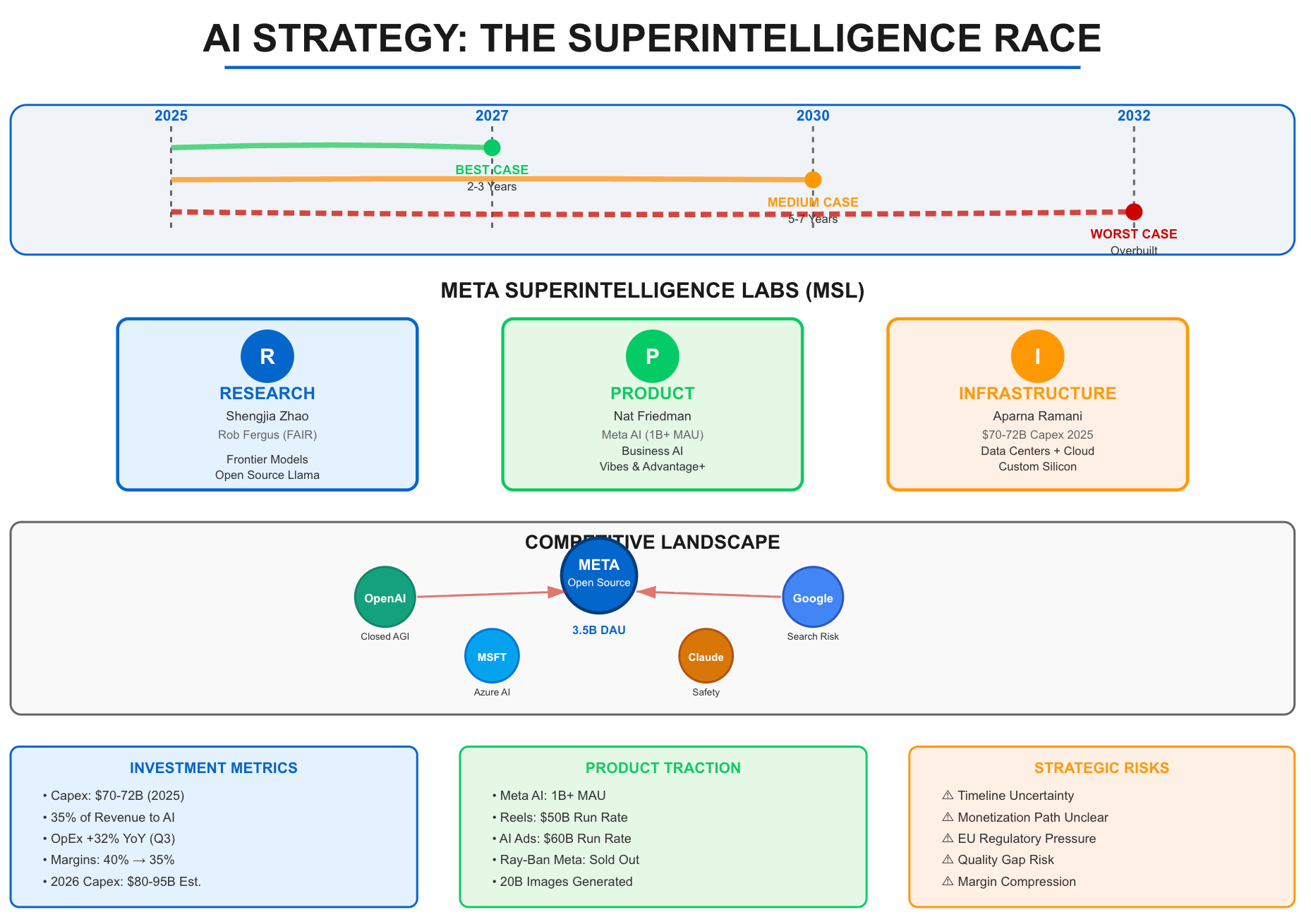 Front-loading capex for superintelligence timeline while core ads accelerate on AI ranking.