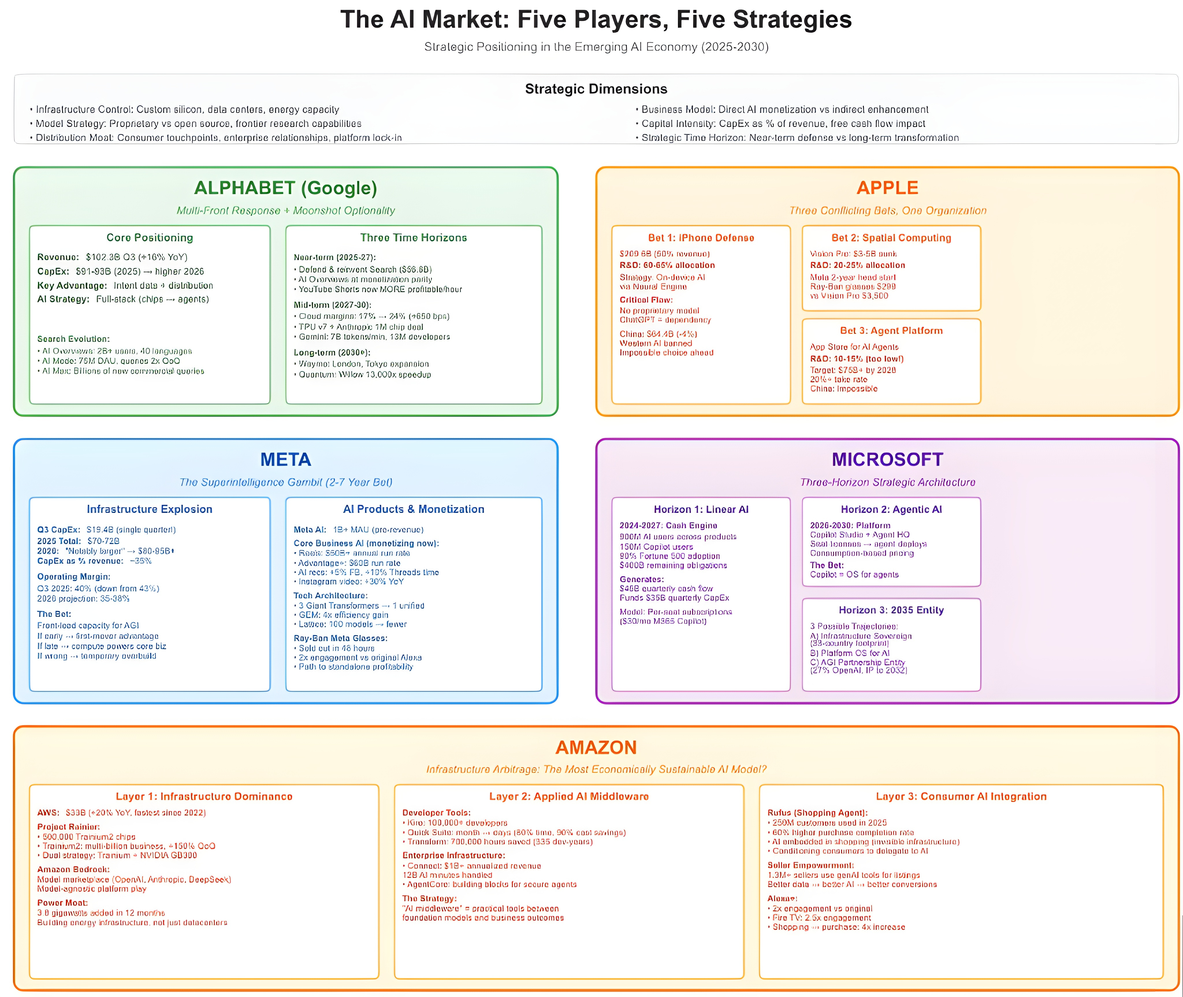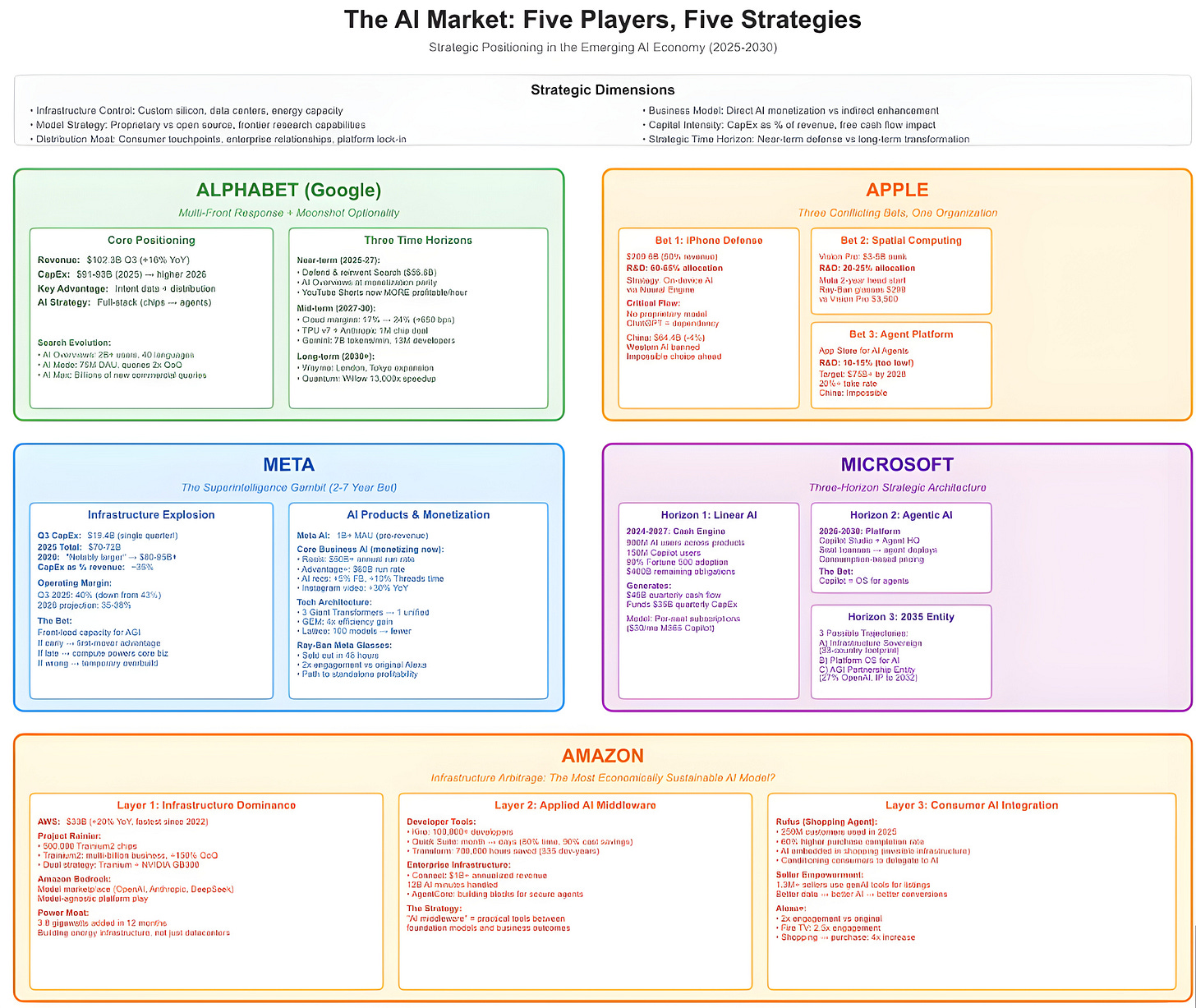 Power is concentrated at two ends of the barbell: industrial AI infrastructure and consumer-grade agent distribution. Alphabet and Microsoft anchor the former, Apple and Meta fight the interface, and Amazon bridges both through commerce. The next 24 to 36 months decide whose moat compounds and whose capex turns into a drag.