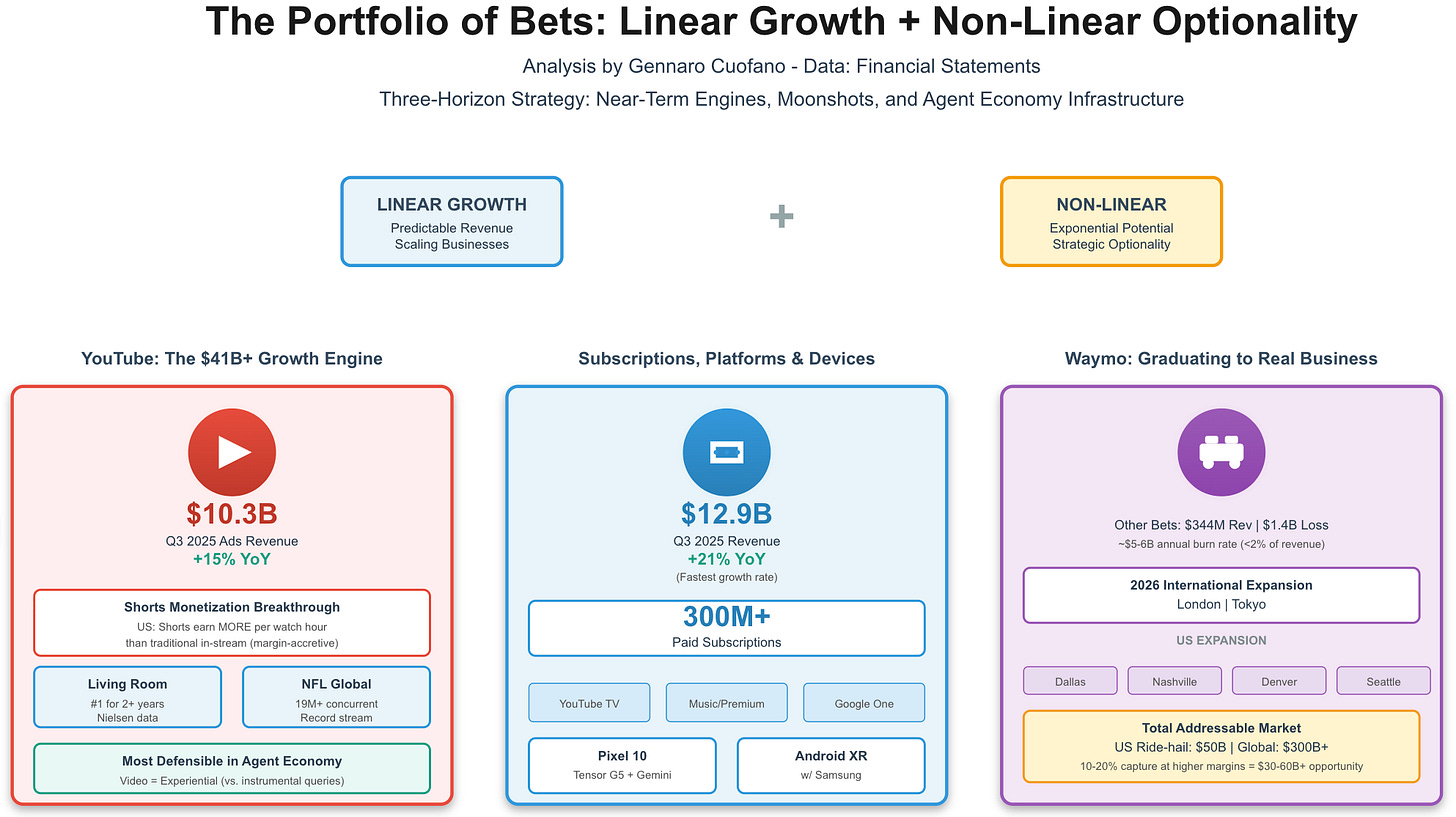 Alphabet isn’t hedging the AI transition—it’s accelerating into it. Q3 shows surprising dexterity: Search growing amid disruption, Cloud margins expanding, Shorts monetizing efficiently, Waymo scaling internationally.