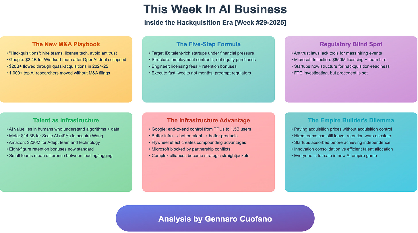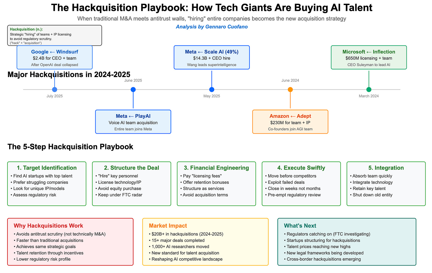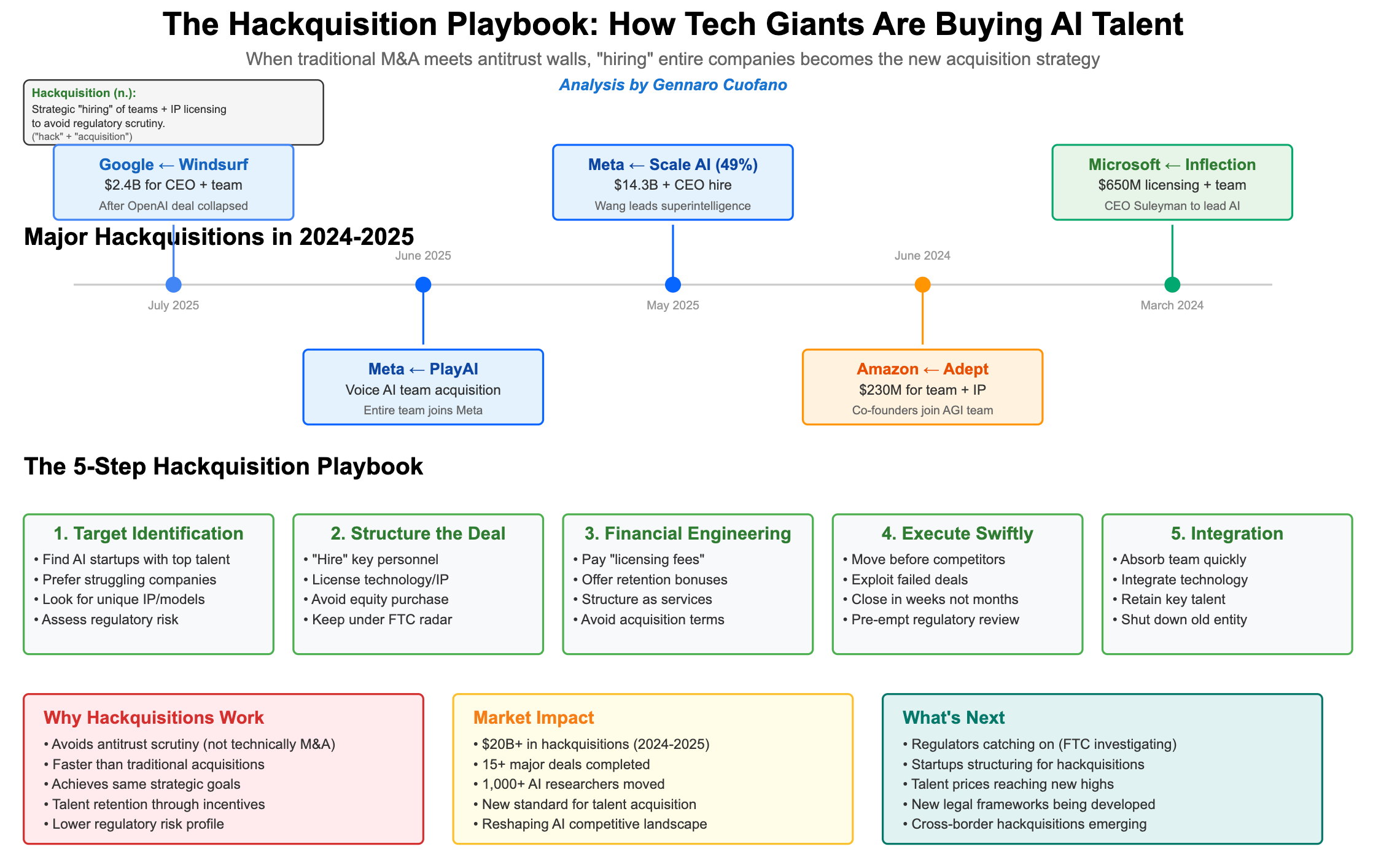Welcome to the era of the hackquisition, where the world's most powerful tech companies have discovered a loophole in the traditional M&A playbook. When you can't acquire a company due to antitrust concerns, you hire all the employees and license their technology.
