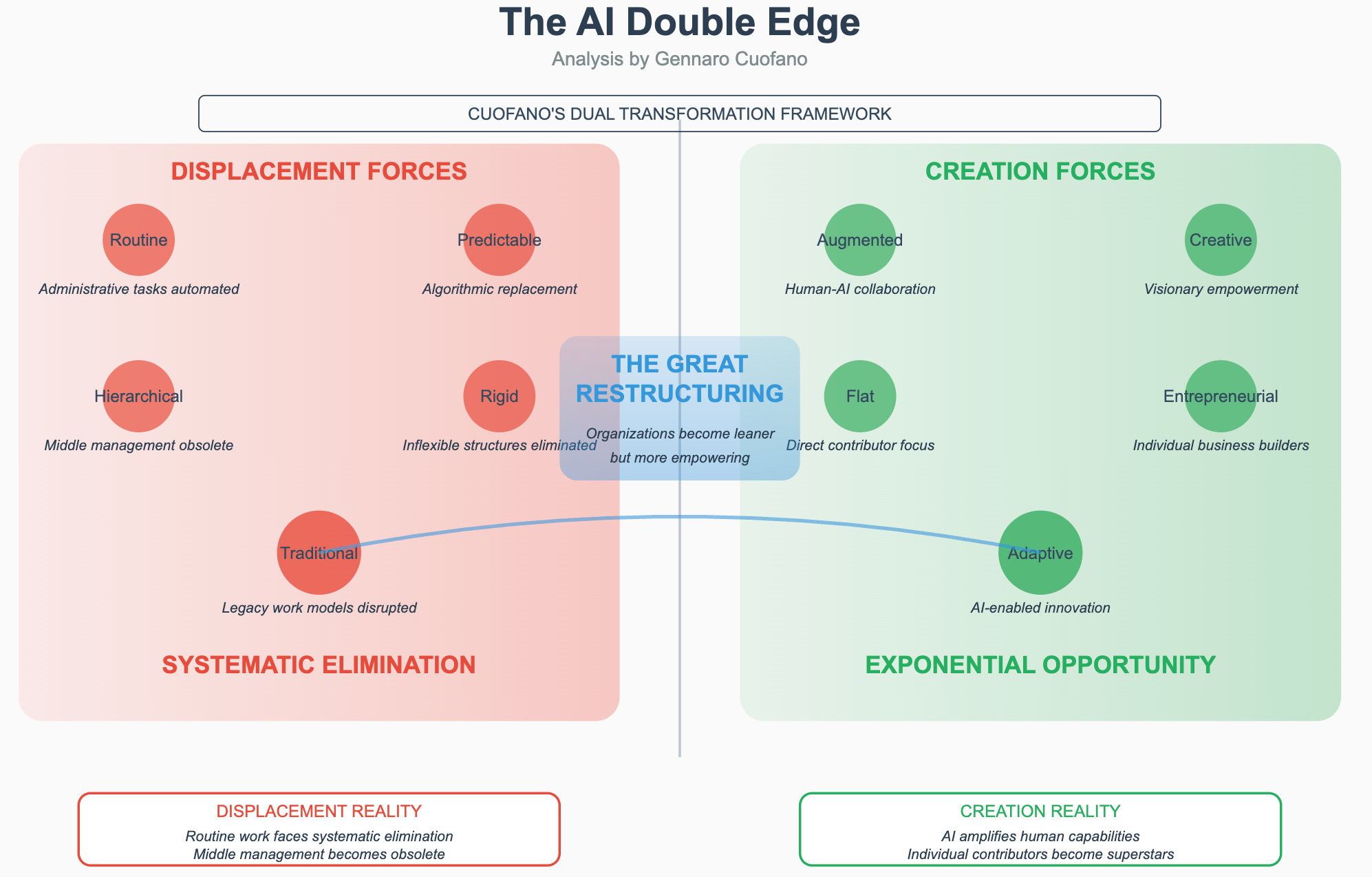 This analysis reveals that AI's impact transcends simple job replacement—it's fundamentally restructuring how organizations operate, empowering individual contributors while rendering middle management increasingly obsolete.