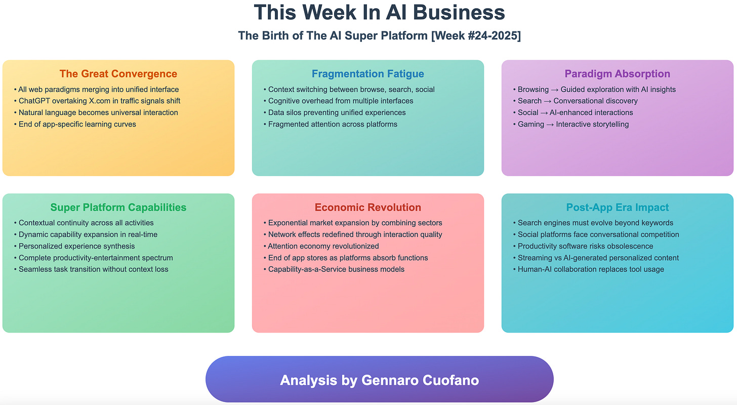 The Great AI Convergence is more than just ChatGPT overtaking X.com in traffic. It's the emergence of a new digital order where browsing, searching, social media, gaming, and streaming are all absorbed and expanded into a unified super-platform that fundamentally changes how humans interact with digital interfaces.