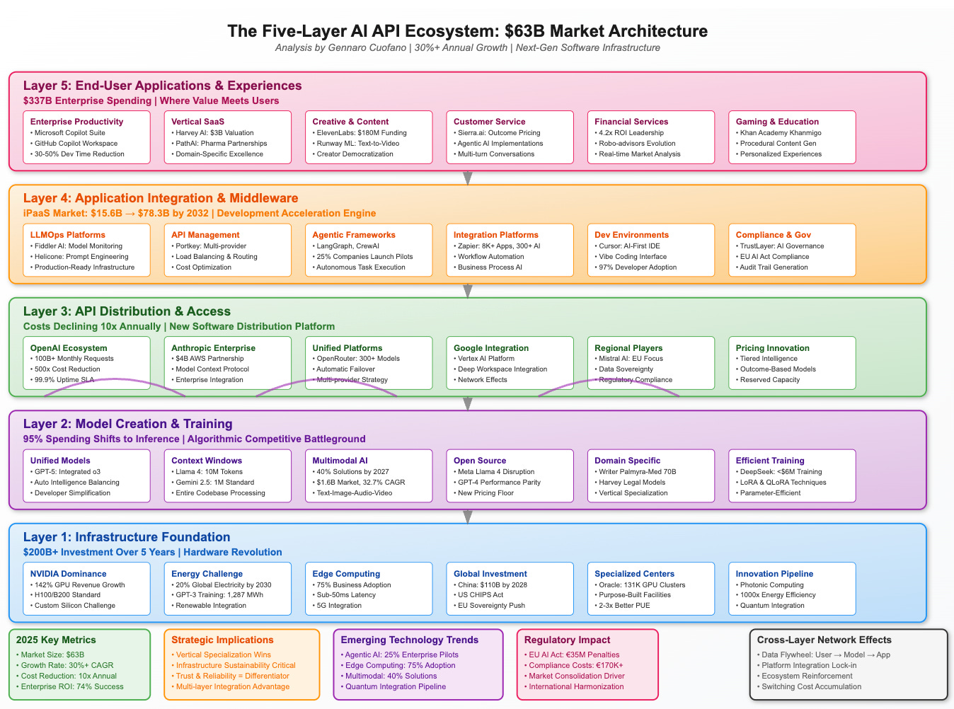 The interconnections between layers create network effects and platform dynamics that determine competitive advantage while emerging technologies like edge computing and agentic AI promise to reorganize the entire structure.