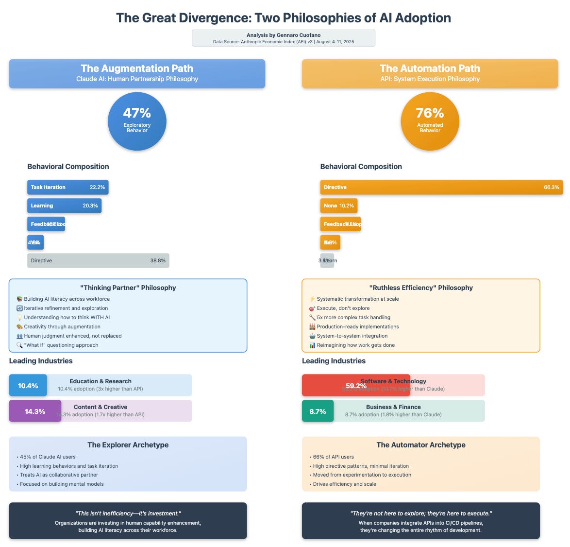 As we analyzed over 130,000 interactions across Claude AI and API platforms during August 2025, a striking reality emerged: organizations aren't adopting AI along a single trajectory, but rather splitting into two fundamentally different paths that reflect competing philosophies about the role of artificial intelligence in work.