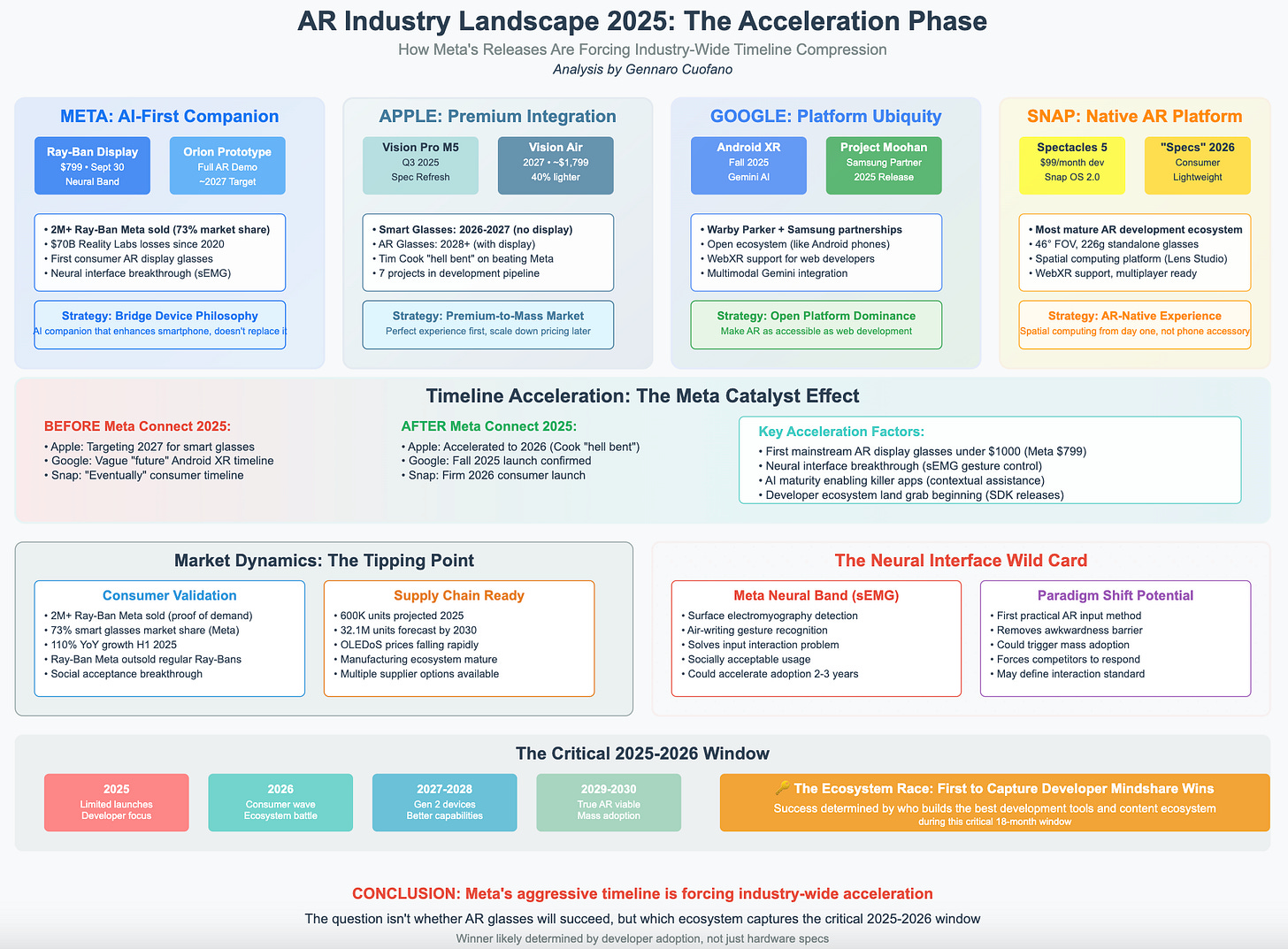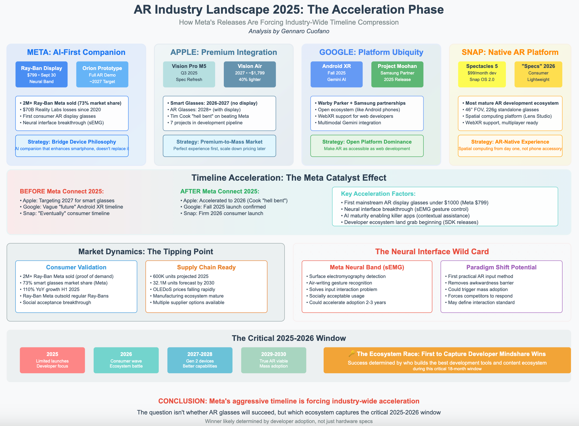 Apple's Premium Integration Path: Apple's roadmap reveals a Vision Pro M5 refresh coming in Q3 2025, followed by a Vision Air in 2027 that's 40% lighter and more than 50% cheaper, as well as smart glasses without displays launching around 2026-2027. Apple is taking its traditional approach: enter with premium products, perfect the experience, then scale down to the mass market.
