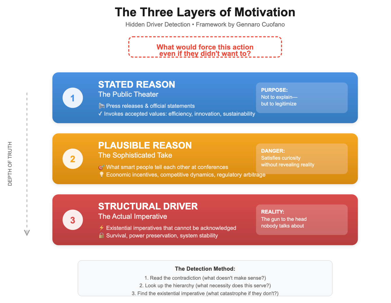 Every major decision in markets, politics, and business operates on three levels simultaneously, but only one matters. The public gets carefully crafted press releases.