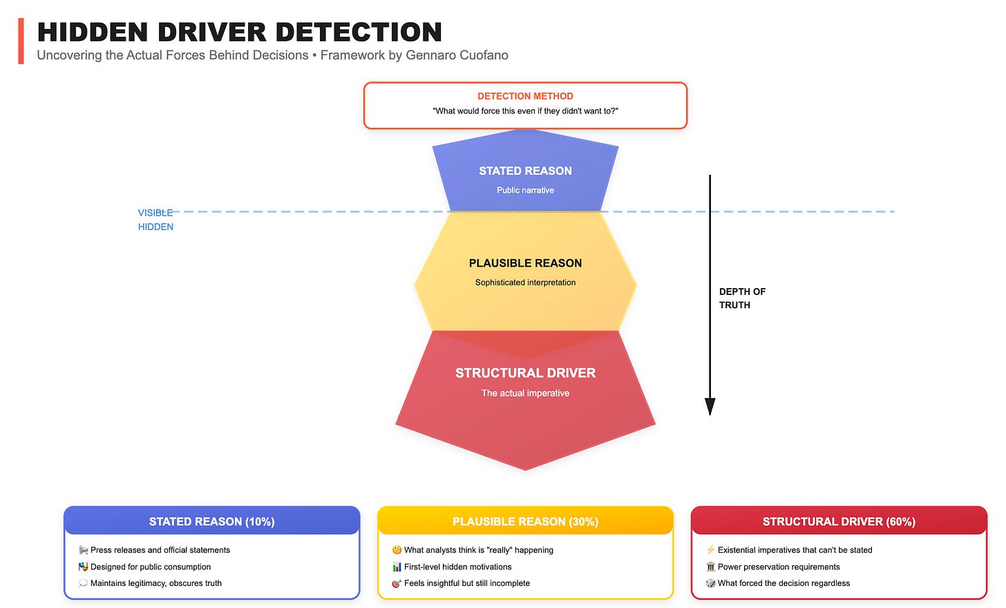 Hidden Driver Detection reveals these actual forces that determine outcomes regardless of cover stories.
